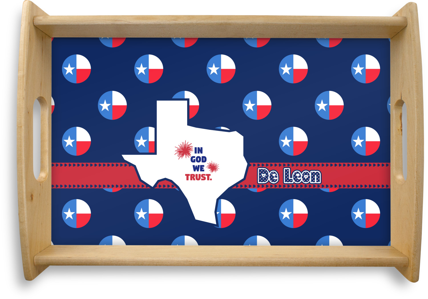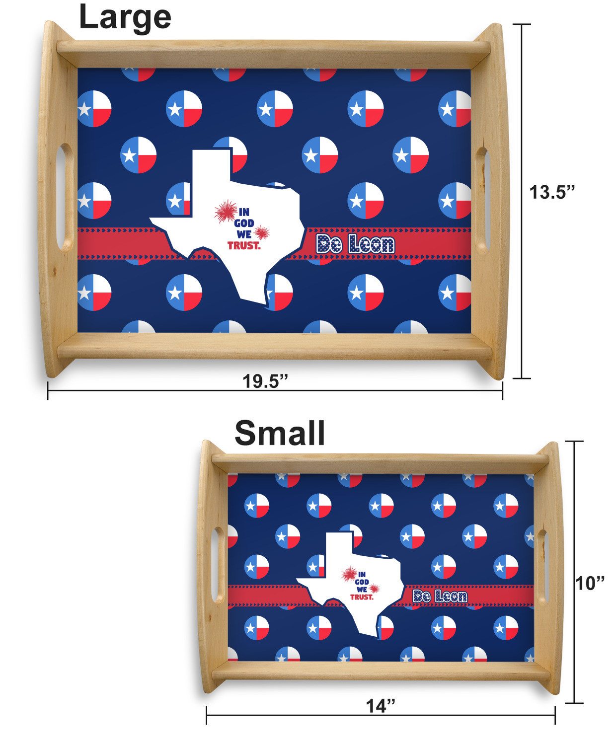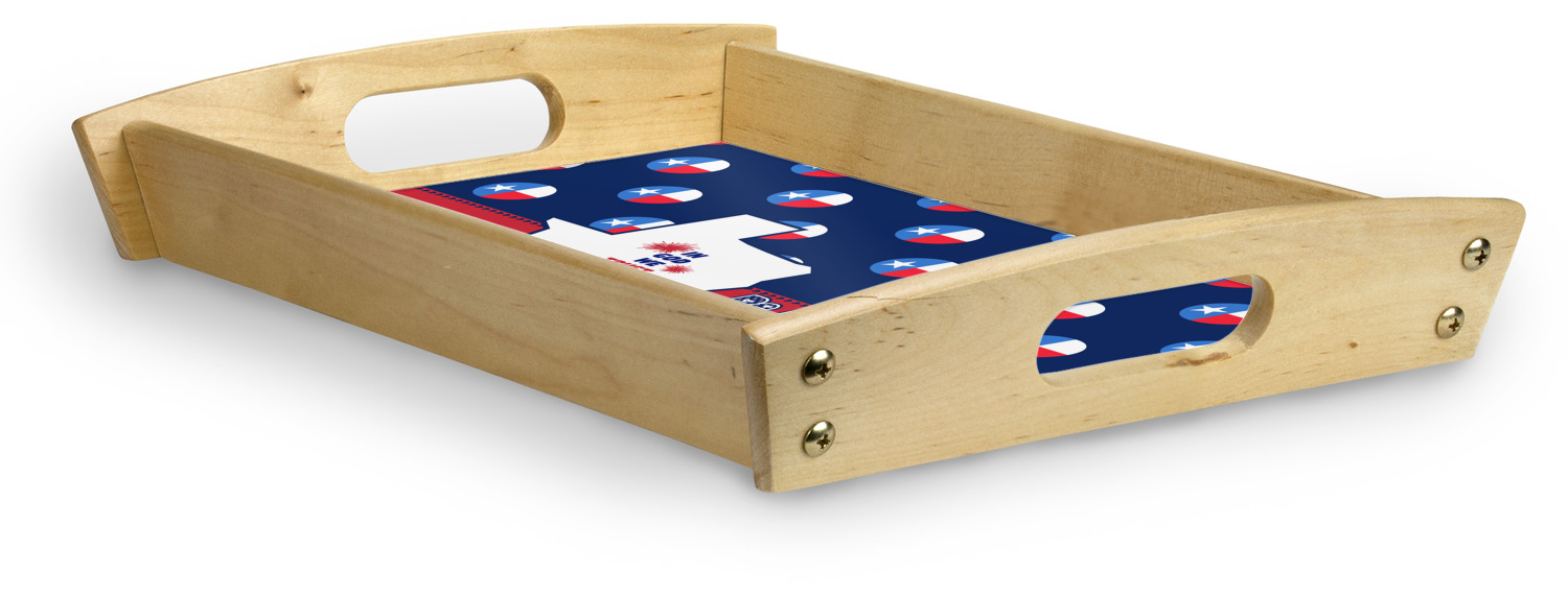 This serving tray with handles features square edges and two rounded sides, creating a very modern look. Each side is fabricated from a beautifully cut, natural wood. The bottom of the interior of the tray displays your customized design in bright, vibrant color. The tray is sold in both a black color and a natural wood look. Each variation of the wood serving tray has two sizes: Small, which is 14" x 10" x 2.25", and Large, which is 19.5" x 13.5" x 2.75".