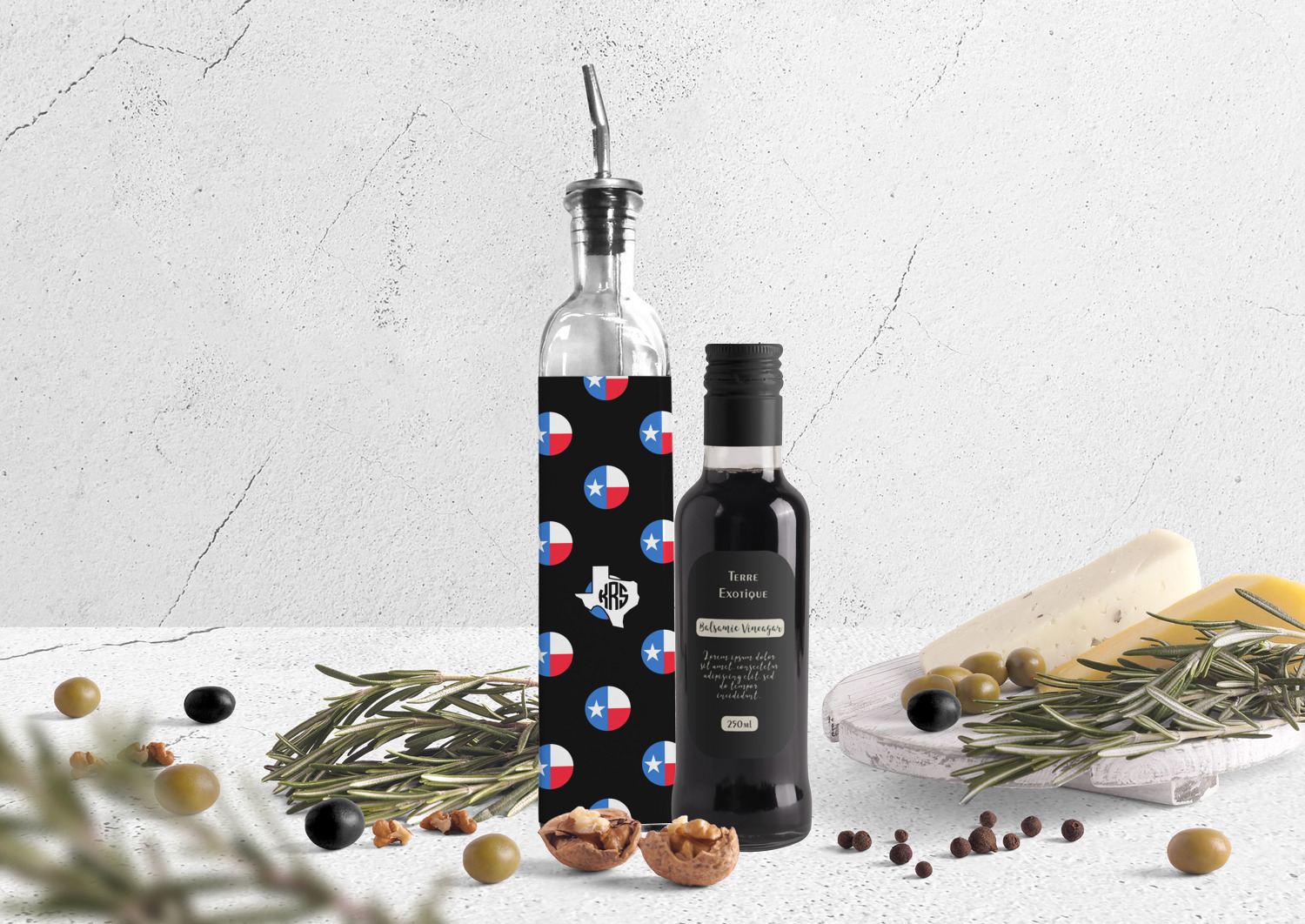 Made from recycled glass in Spain, these oil bottles have a classic, delicate look, and are accompanied by a metal spout for controlled pouring. Each bottle holds approximately 13 ounces and measures at 12 by 2 inches. We customize your glass oil bottle by applying your personalized design on the front and sides, using an adhesive. Our customizable stickers are made from high quality, gloss vinyl and are printed with waterproof, eco-solvent inks. These pieces are machine cut for accuracy and symmetry. The result is a robust, waterproof, adhesive decal that will not fade or deteriorate with time.