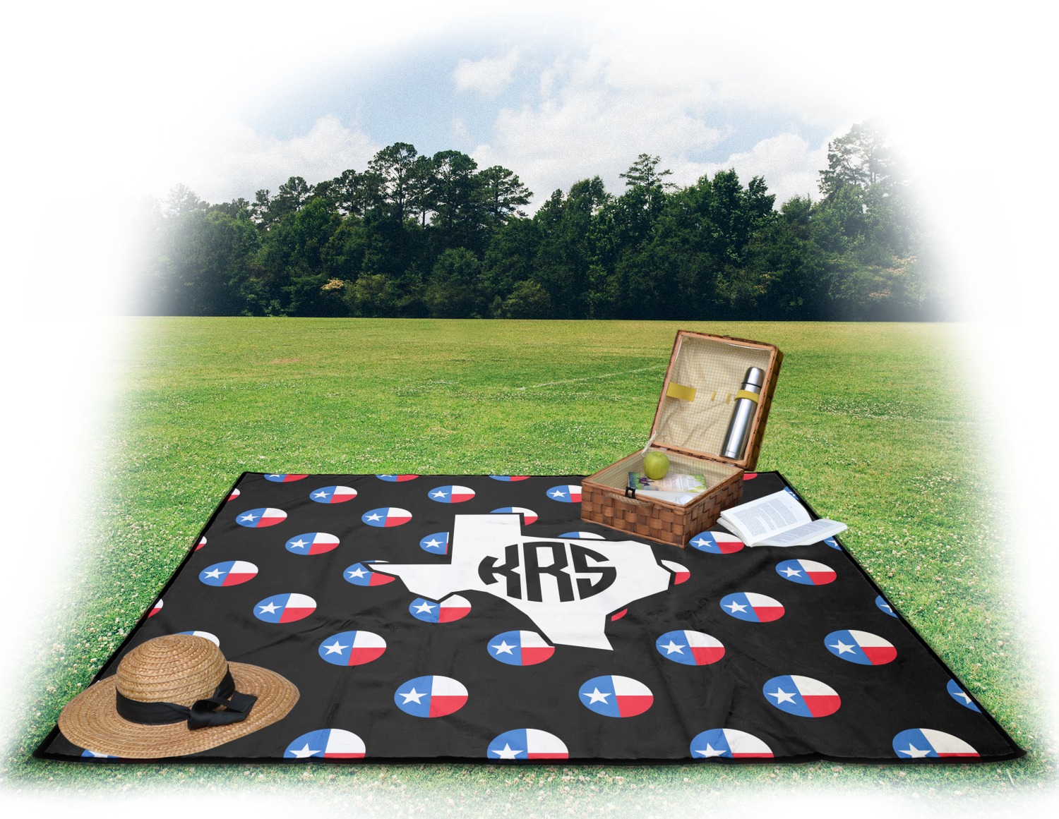 This picnic blanket is perfect for hanging out with your friends at the park or anywhere outside. The top of the blanket is made of a super soft microfiber fleece. The bottom of the blanket is made of a black material similar to a rain jacket and is water repellent as well. This will keep any wet spots on the ground from soaking through your picnic blanket. No one likes a wet blanket. The blanket measures at approximately 50" x 59" and has a nicely finished ribbon edge.