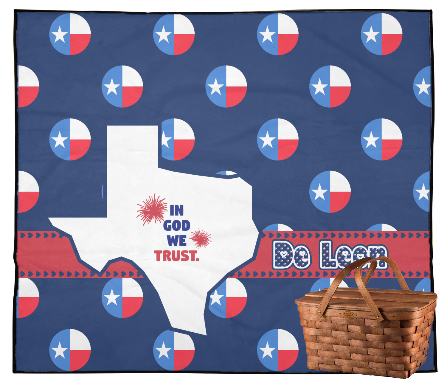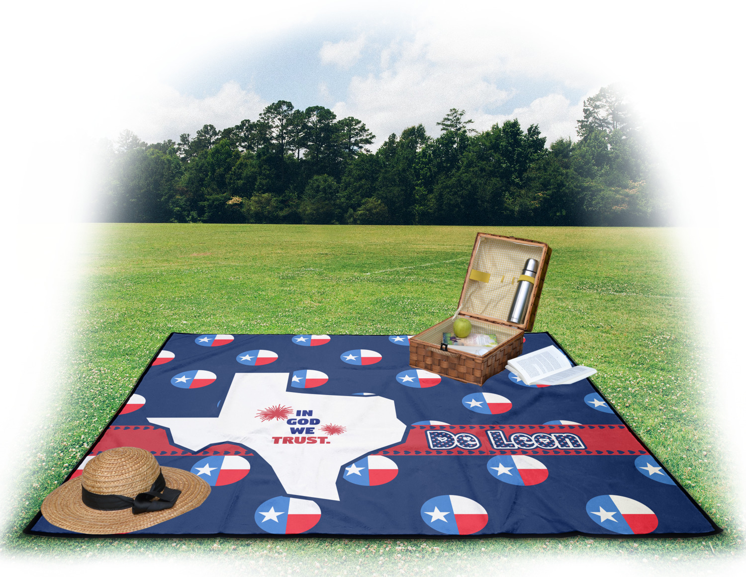 This picnic blanket is perfect for hanging out with your friends at the park or anywhere outside. The top of the blanket is made of a super soft microfiber fleece. The bottom of the blanket is made of a black material similar to a rain jacket and is water repellent as well. This will keep any wet spots on the ground from soaking through your picnic blanket. No one likes a wet blanket. The blanket measures at approximately 50" x 59" and has a nicely finished ribbon edge.