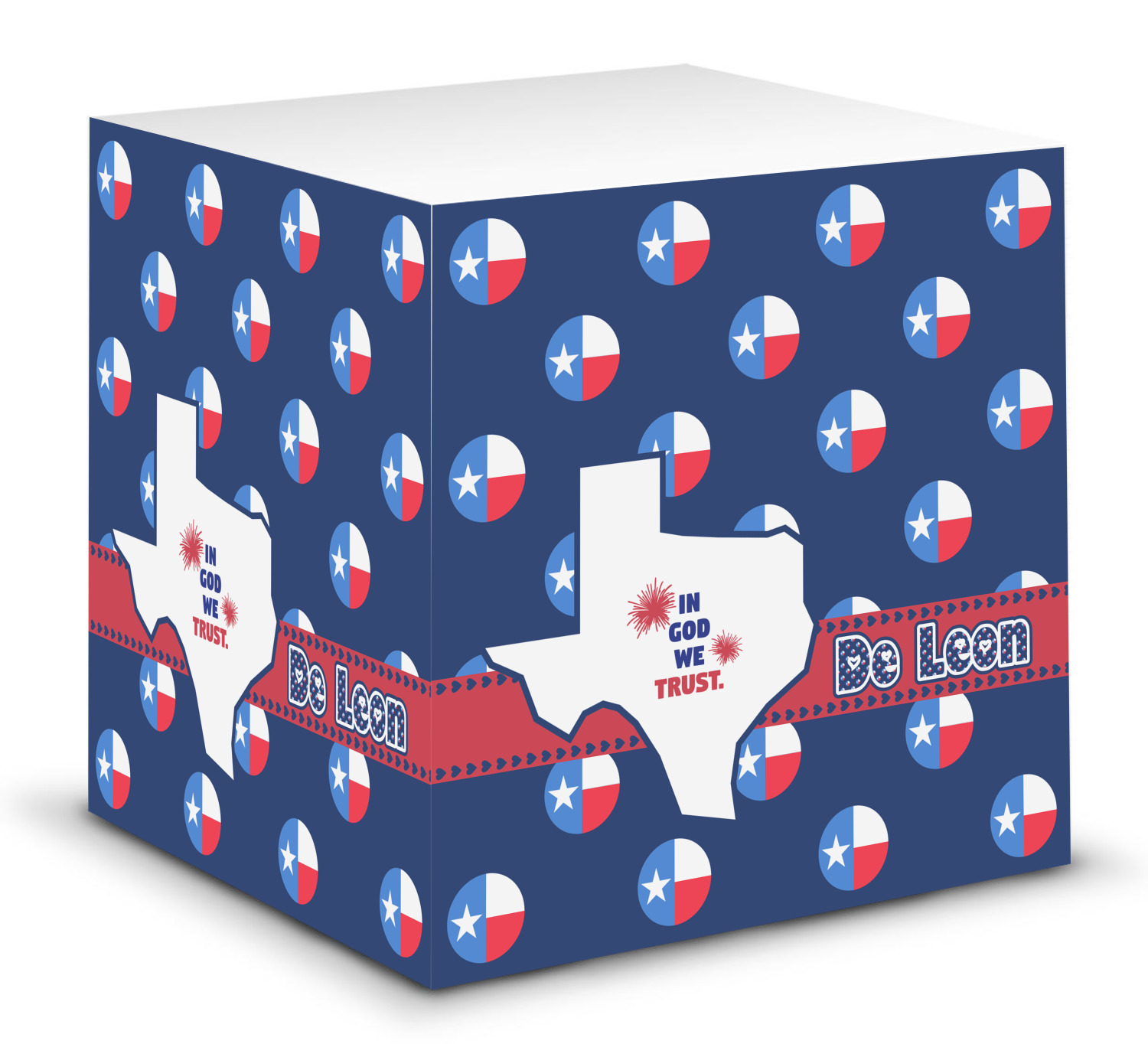 This note cube features 700 sheets of matte, white paper. Each sheet measures at 3.5 by 3.5 inches and has an adhesive strip at its top. Your personalized design is displayed on all four edges of the sticky pad.