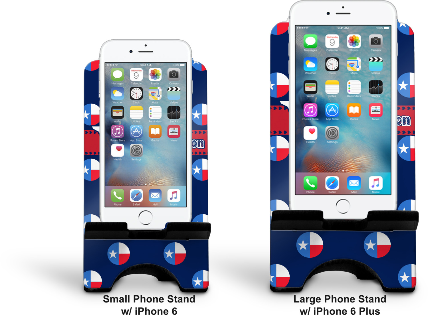 To meet your needs, we offer four variations of this IPhone stand. The backboard of the first version is shaped as a plain, yet sleek rectangle, and is available in two sizes. Our smaller size is approximately 4 by 3.25 by 7 inches, while the larger model is 4 by 3.77 by 8.5 inches. Alongside this model, we also provide you with a more decorative option. The upper part of our second version features a curved edge, for a classy, suave appearance. This phone holder is also sold in two sizes: a smaller version, which is 4 by 3.25 by 7 inches, and our larger model, which is 4 by 3.77 by 8.5 inches. Both models will support large phones, but the larger model is better if you wish to proudly display your personalized design.