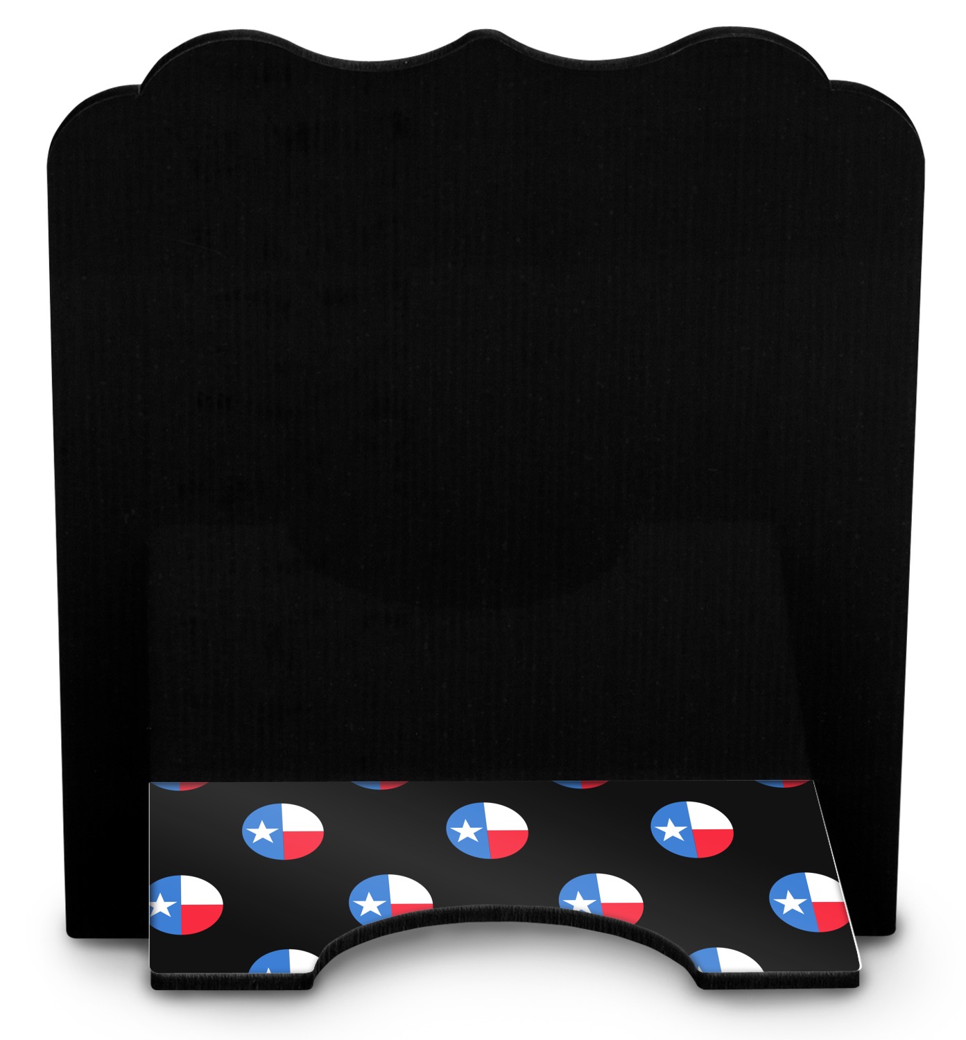 The stand is comprised of two hardboard pieces that fit snugly together and stabilize one another. The bottom part of the iPad stand supports your tablet, and has space for your tablets charger while in use. At 9.25" x 11.5", this tablet mount can support a device between the sizes of the iPad Pro and the iPad Mini 2. The uppermost part of the stand features a decorative, curved edge for a classy, suave appearance. We print your customization atop the face of the stand, in vibrant color. The remaining sides are colored a sleek black.