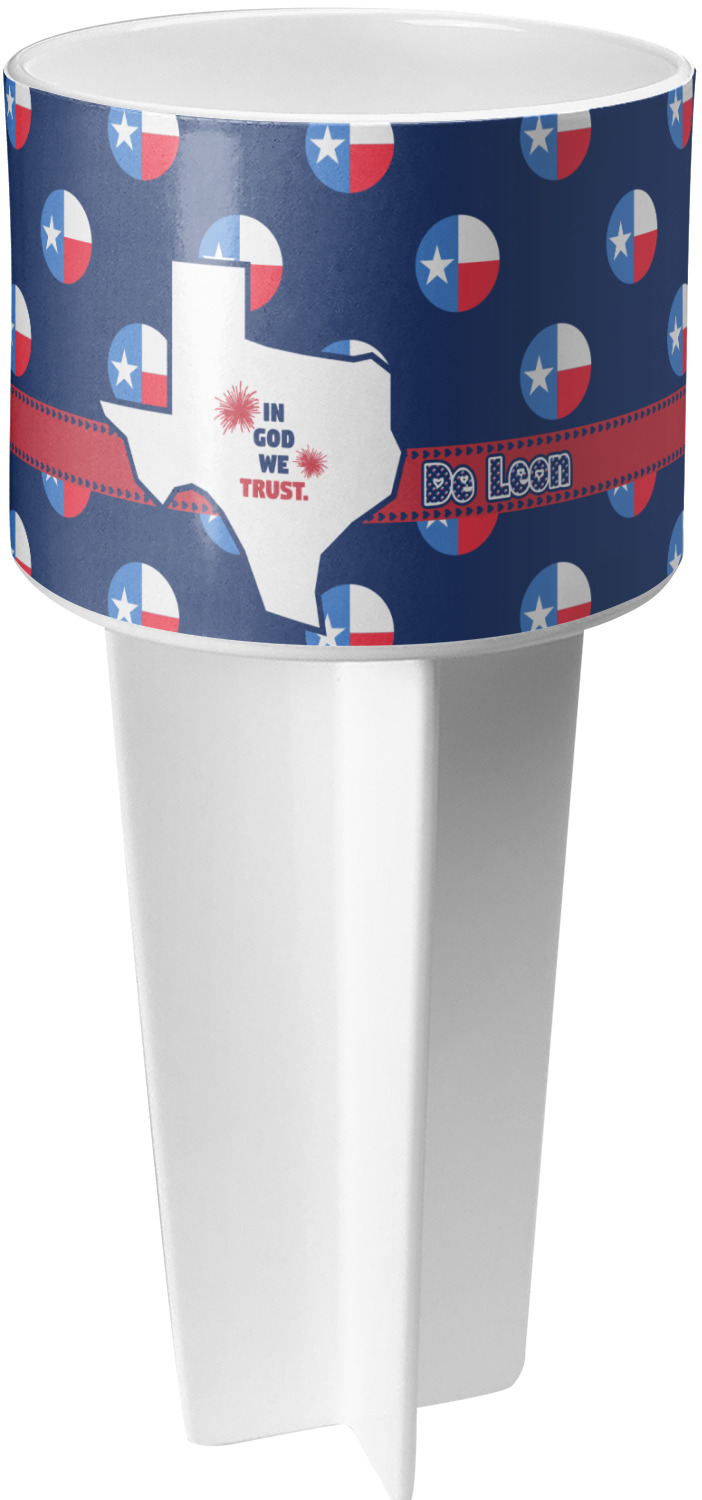 This cup holder has a large stake at its bottom that anchors it to the sand or ground below, while the cup holder rests above the stake. The entire drink holder is made of durable plastic and displays your customization around the cup holder portion. We sell these personalized beach spikers in two different colors: black and white.