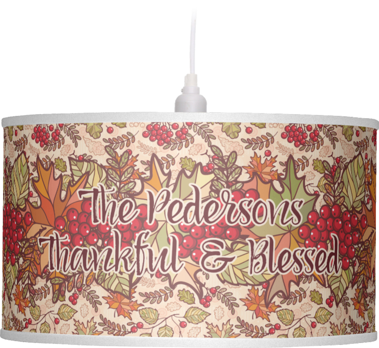 These pendant lampshades are in a cylindrical, drum shape. Available in 2 sizes - 16 inch diameter and a height of 10 inches or 12 inch diameter with a height of 8 inches, this lantern pendant light will not go unnoticed in your home. The interior of this light shade is made of flexible, smooth plastic, and the base color of the lamp is white. Your personalization is displayed on the exterior of this custom lampshade. The fabric shades the fabric fully wraps the ring for a sleek look. Your purchase includes a 12 foot long cord that has a convenient on and off switch attached, the cord is black in color with a tasteful cloth covering over the cord to add the sophisticated look to this light fixture. This lamp can fit a 60 or 75 watt light bulb, but the bulb is not included. Please scroll through the images above to learn more about the structure and shaping of this lamp compared to the other ones we offer.