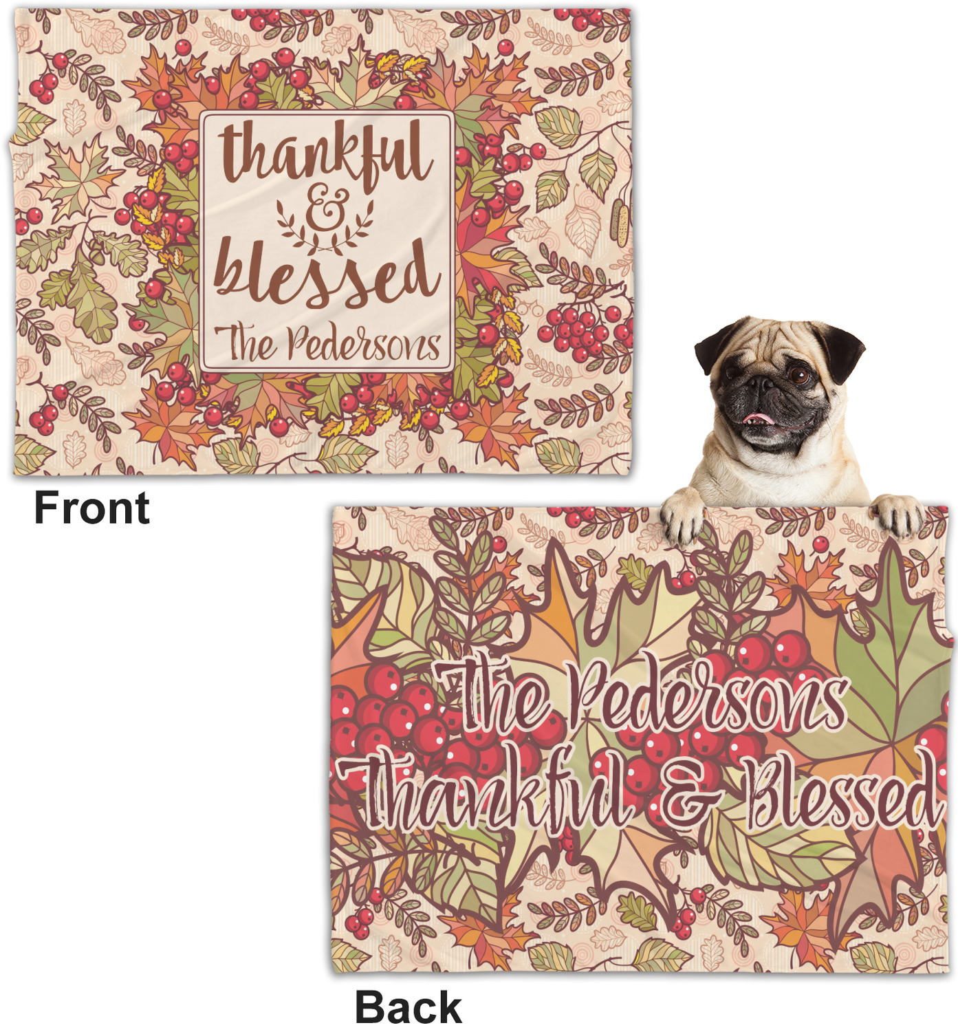 These dog blankets are crafted from a gentle, soft-to-the-touch, minky material. We print your customizations, either matching or differing, on both the top and underside of the blanket. These personalized dog blankets are available in two sizes: regular and large. Our regular size, at 40" x 30", accommodates small and some medium size dogs. At 60" x 50", our large dog blanket is a better fit for bigger breeds. Though specialized for dogs, these blankets still make a thoughtful gift for your favorite feline, or any other pet in mind!