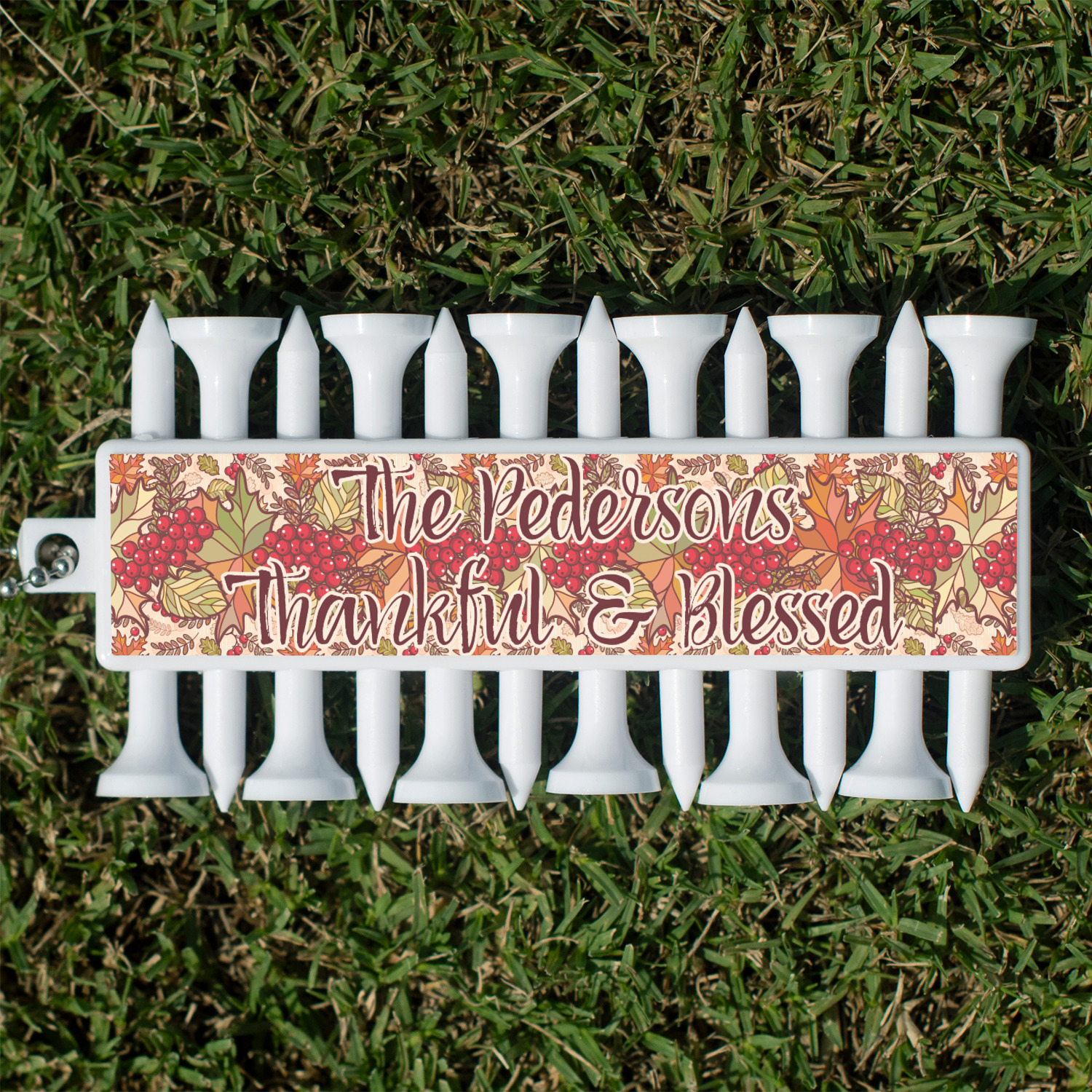 With 12 tees on a lightweight, portable key chain, it almost ensures a great 18 holes. Our tees are made of white plastic and are a little over 2". Design the front and the back of the golf tee holder. Pick from over a hundred designs, colors, and personalization styles! The set even comes with three removable ball markers as well!