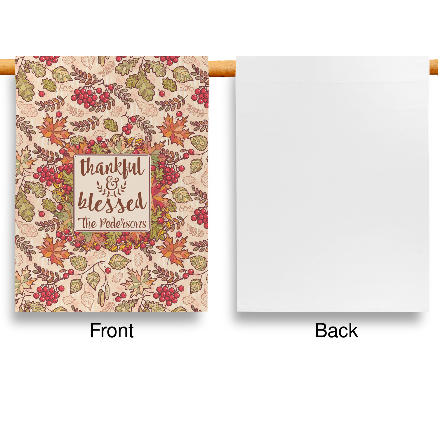 These custom garden flags are made of a durable, double-ply, polyester weave, allowing them to withstand the elements year round. The small flags measure at approximately 12 by 18 inches. The large flags measure out to 28 by 37 inches. You can order these decorative flags with your customization printed on the front only, or the front and back.