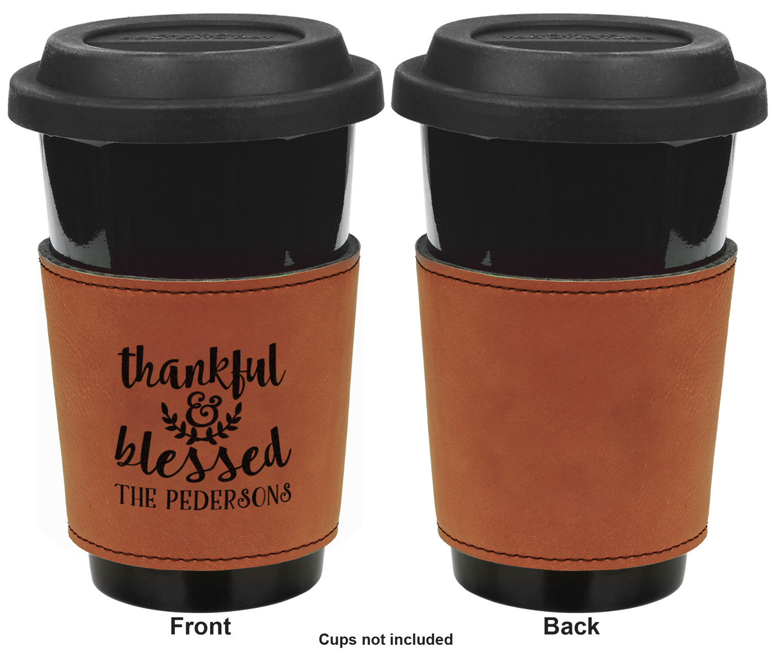 This cup sleeve is made from a suave, cognac-brown leatherette and finished with an intricate, black stitch. The interior of this can sleeve is fabricated from a thin foam material to help insulate your mug's contents. The sleeve is specifically made to suit tapered glasses or mugs, so the top's diameter is 3.5 inches, while the bottom's diameter is 2.75 inches. Your customized design will be laser engraved into the leatherette, leaving behind crisp, black imprint. With these products, we provide you with the option of engraving the front and back, or the front only.