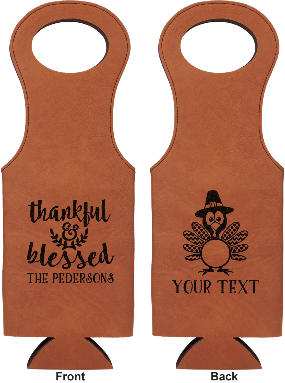This wine carrier is made from a stunning leatherette, in a cognac-brown color. Strong, black stitching lines the sides of your wine bottle bag and provides extra durability. The interior is lined with a padded, black material to allow for a snug fit once your bottle is placed inside. At the top of this wine gift bag, you'll find two oval shaped handles that elegantly complements the rest of the bag's style. We provide you with the option of laser-engraving the front, or the front and back of your new personalized wine bag!