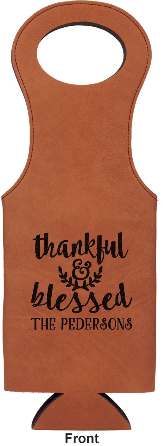This wine carrier is made from a stunning leatherette, in a cognac-brown color. Strong, black stitching lines the sides of your wine bottle bag and provides extra durability. The interior is lined with a padded, black material to allow for a snug fit once your bottle is placed inside. At the top of this wine gift bag, you'll find two oval shaped handles that elegantly complements the rest of the bag's style. We provide you with the option of laser-engraving the front, or the front and back of your new personalized wine bag!