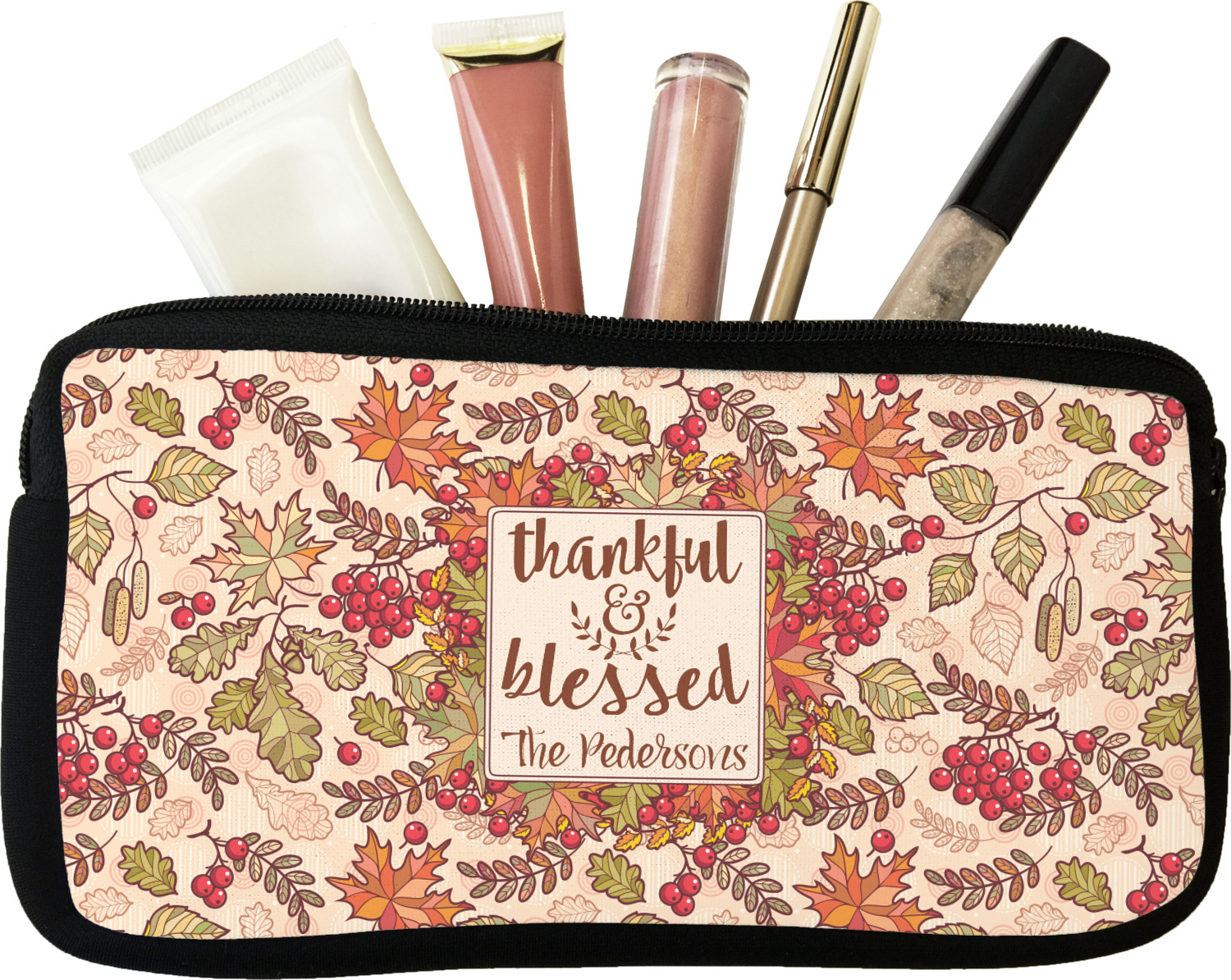 Our personalized makeup bags are available in many different designs, patterns and colors - so you are sure to find one that will love. They are made of neoprene (same material as wet-suits) and thus are water resistant, so spillages in your makeup bag will not end up all over you purse. They are customized on one side and are black on the other side and the zipper is black as well.