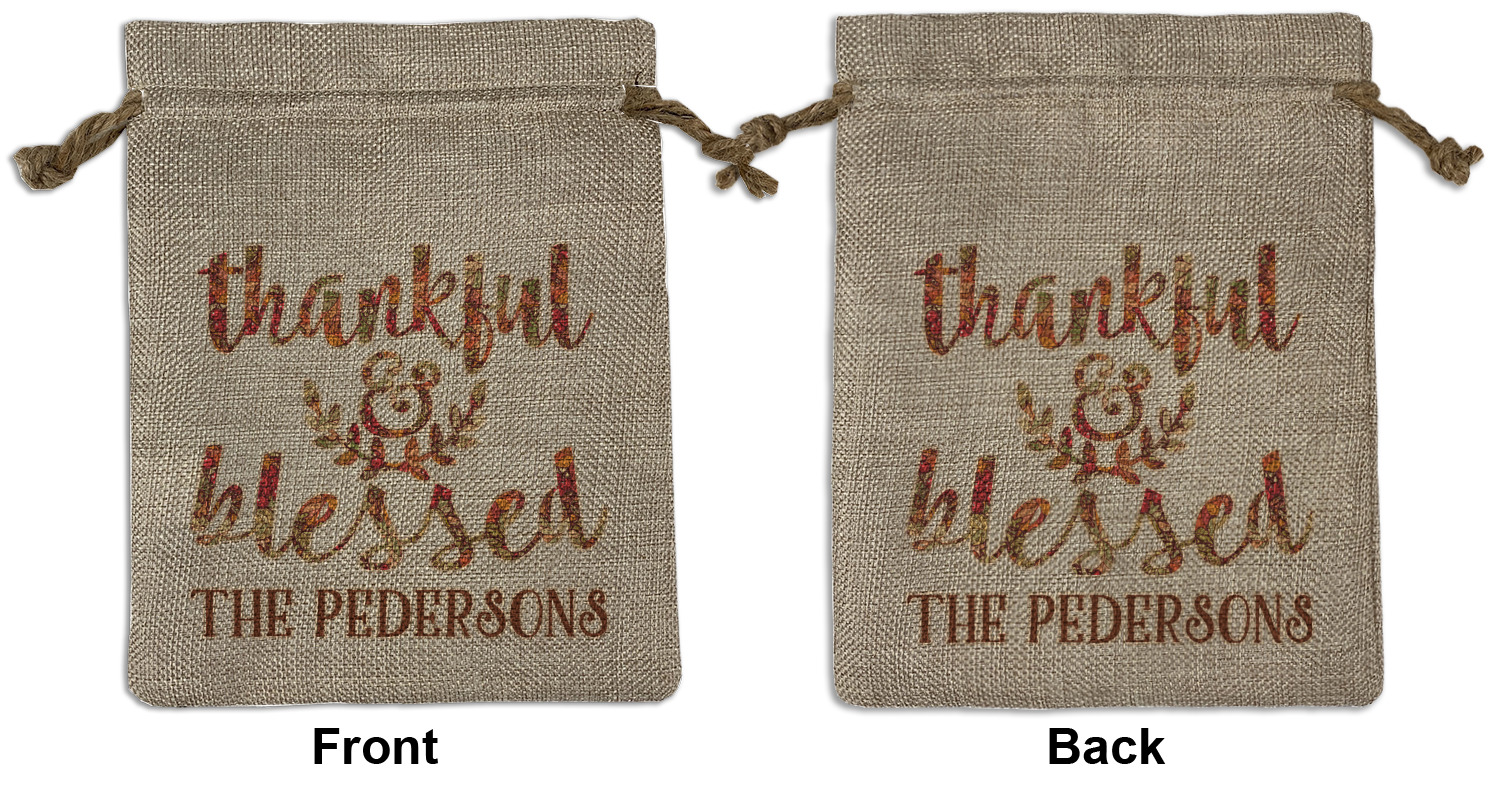 We sell our Burlap Gift Bags in 3 variant sized bags. Made with burlap polyester, each personalized bag can be secured with a twine drawstring pull. Your custom design is available to print on one side or both sides - completely up to you! The sizes of the bags measure approximately 4.5" x 6.5" for the smallest size, 6.5" x 8.0" for the medium size, and 6.5" x 13.5" for the large-sized bag.