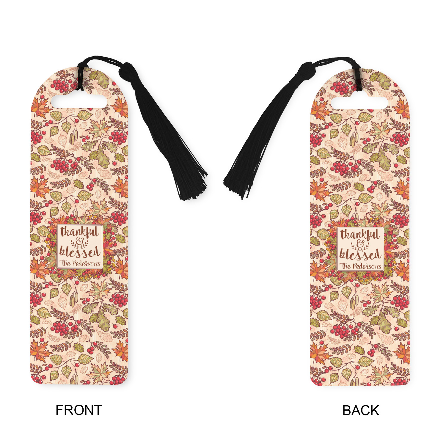 Made from a durable, flexible plastic, these bookmarks are printed with your custom design on them. With the tassel on them they make it easy to find your page in your book. These are a rectangular shape 7 1/4 inches tall with a rounded top and are approximately 2 1/4 inches wide.