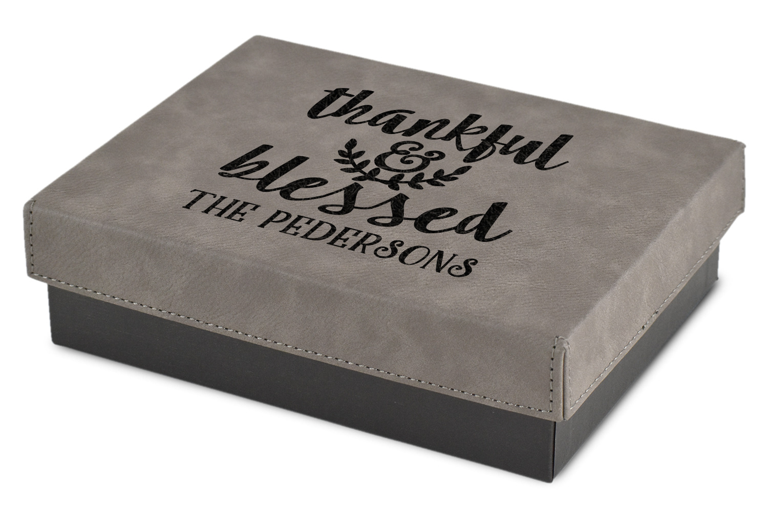 These gift boxes are available in 3 different sizes to accommodate various sized gifts. Available in gray as a neutral color for any occasion as well as to showcase your design boldly. Engraved with a laser this high quality paper board and faux leather gift box is unique and makes any gift stand out.