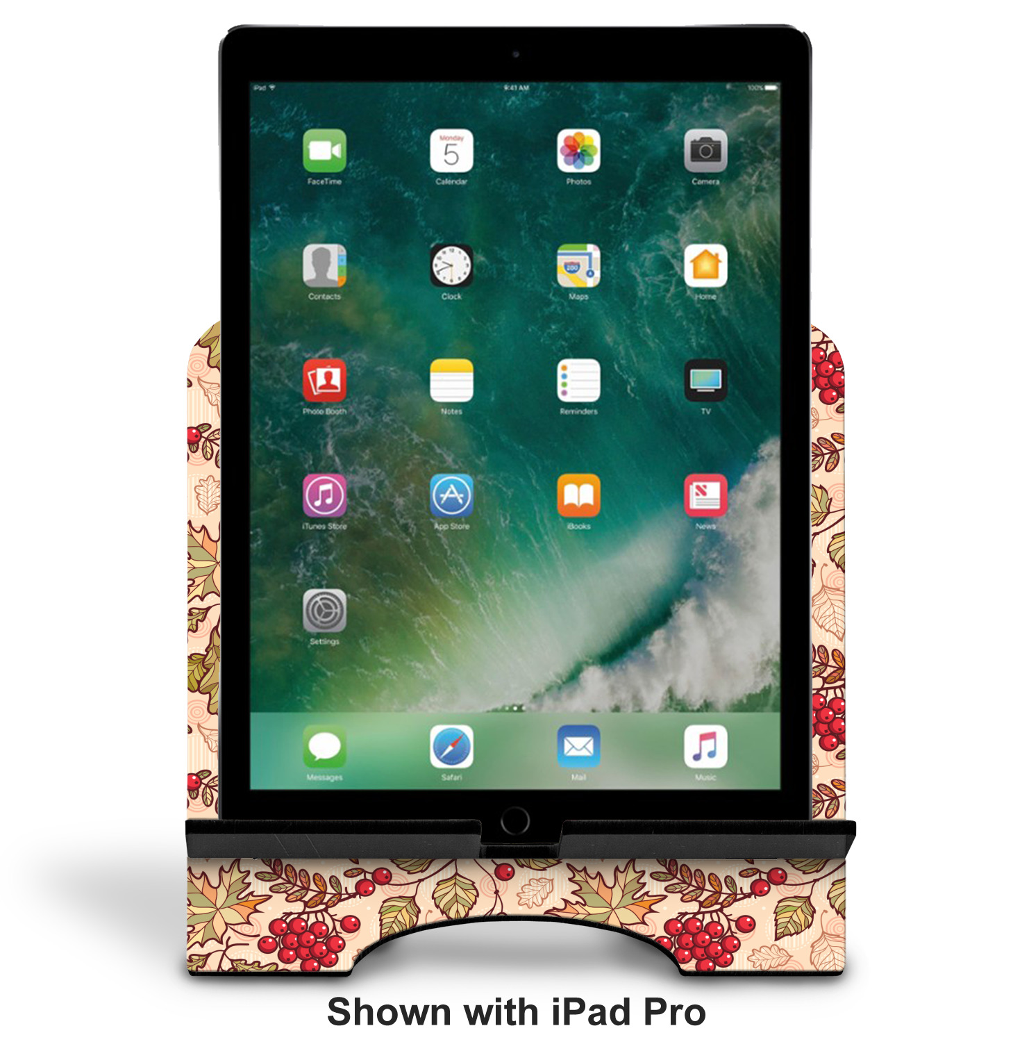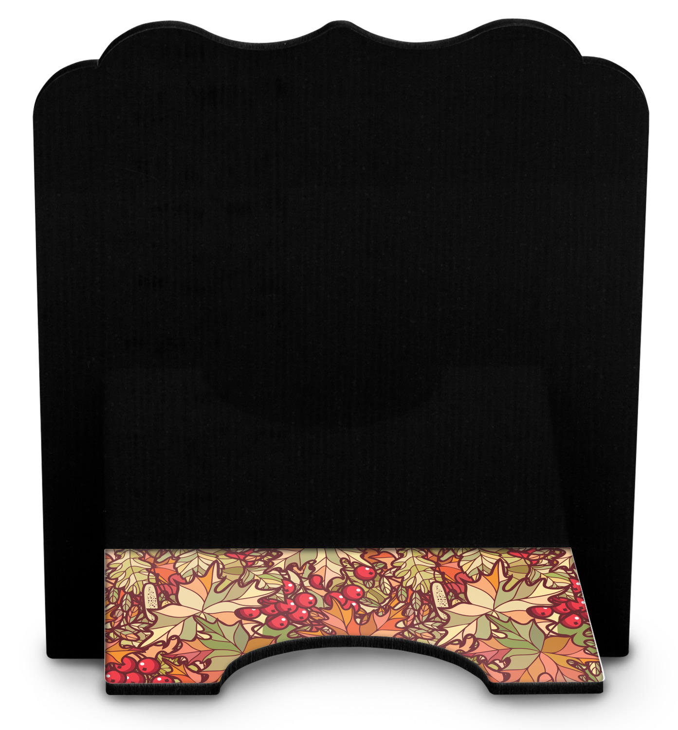 The stand is comprised of two hardboard pieces that fit snugly together and stabilize one another. The bottom part of the iPad stand supports your tablet, and has space for your tablets charger while in use. At 9.25" x 11.5", this tablet mount can support a device between the sizes of the iPad Pro and the iPad Mini 2. The uppermost part of the stand features a decorative, curved edge for a classy, suave appearance. We print your customization atop the face of the stand, in vibrant color. The remaining sides are colored a sleek black.