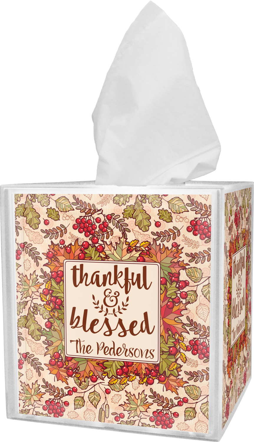 These tissue holders are built from durable acrylic and display your unique personalization on fine-quality vinyl inserts placed within the four sides and top. The box features two pieces, allowing you to easily switch out tissue boxes. On the sides, youll find ridges that ensure the top and base fit securely in place. The bottom of these tissue box holders has four, rubber, non-slip pads to prevent the box from scuffing any surface you decide to display it on. Each box can fit a standard 5 by 5-inch box of tissues.