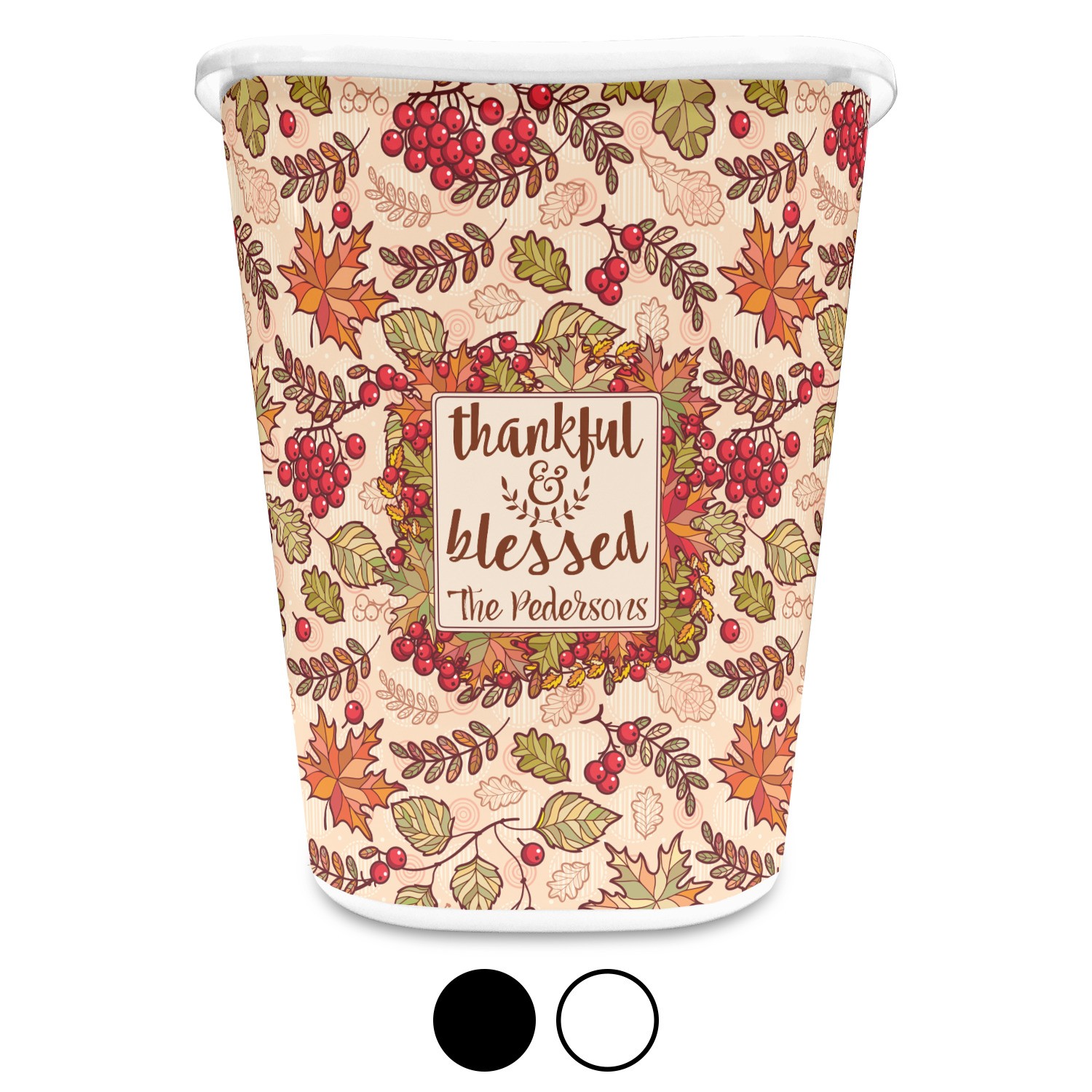 You can choose to purchase these decorative wastebaskets in either a white or a black color that will show on the base and the upper rim. Your customization is printed on a high-gloss, fine-quality vinyl adhesive, and you can choose to either have this adhesive applied to one side only or to both sides. As such, this plastic wastebasket can be single-sided or double-sided, depending on your creative vision. Your customization is printed using durable inks, making the design waterproof and resistant to fading over time.