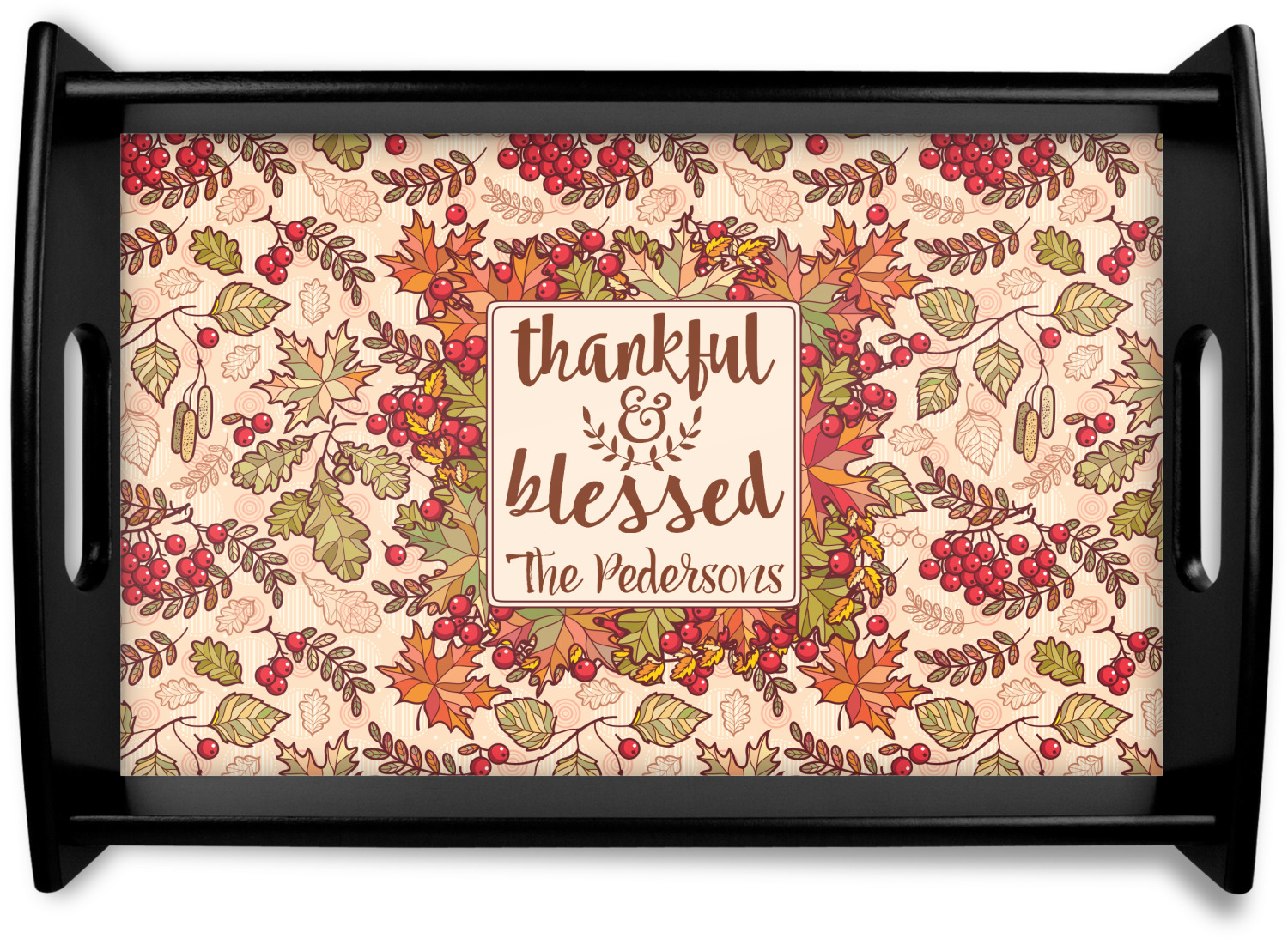 This serving tray with handles features square edges and two rounded sides, creating a very modern look. Each side is fabricated from a beautifully cut, natural wood. The bottom of the interior of the tray displays your customized design in bright, vibrant color. The tray is sold in both a black color and a natural wood look. Each variation of the wood serving tray has two sizes: Small, which is 14" x 10" x 2.25", and Large, which is 19.5" x 13.5" x 2.75".