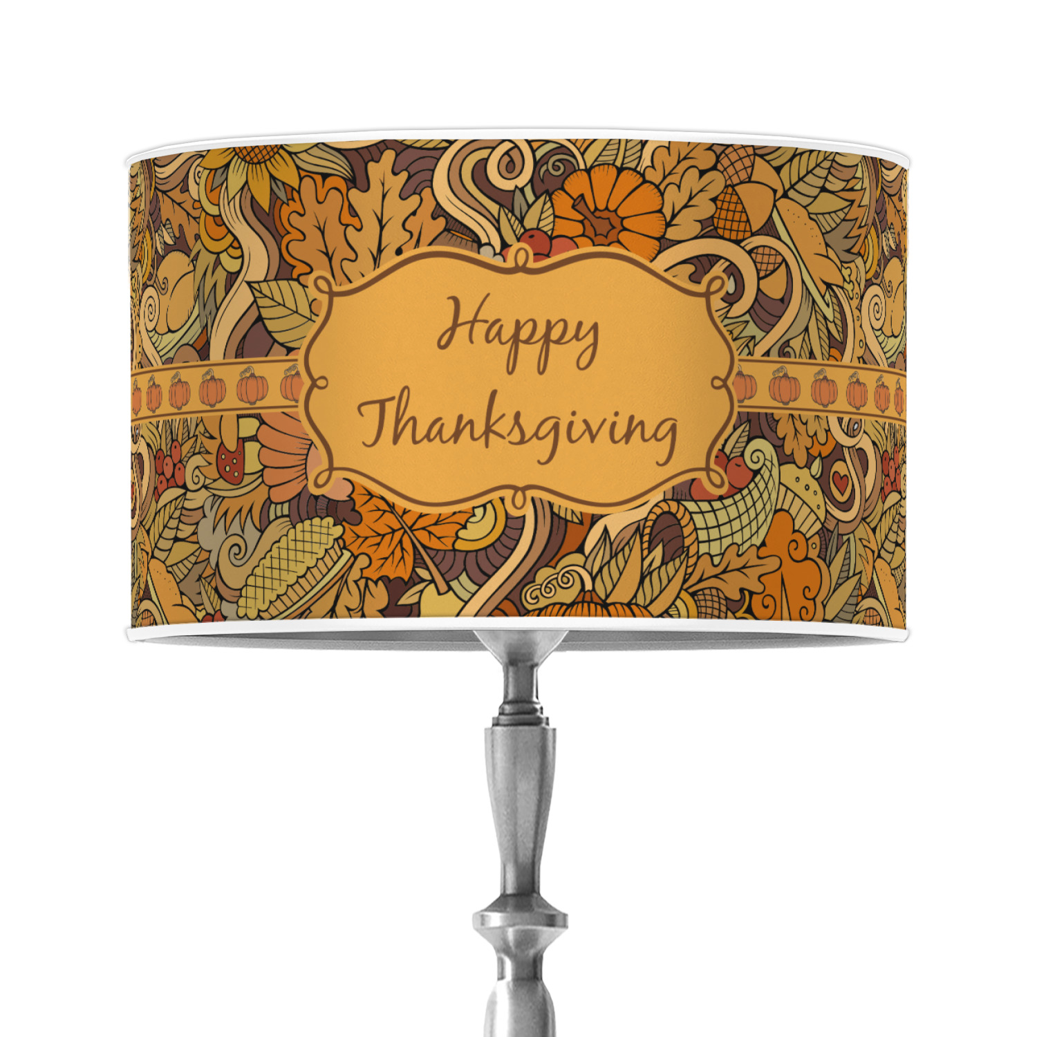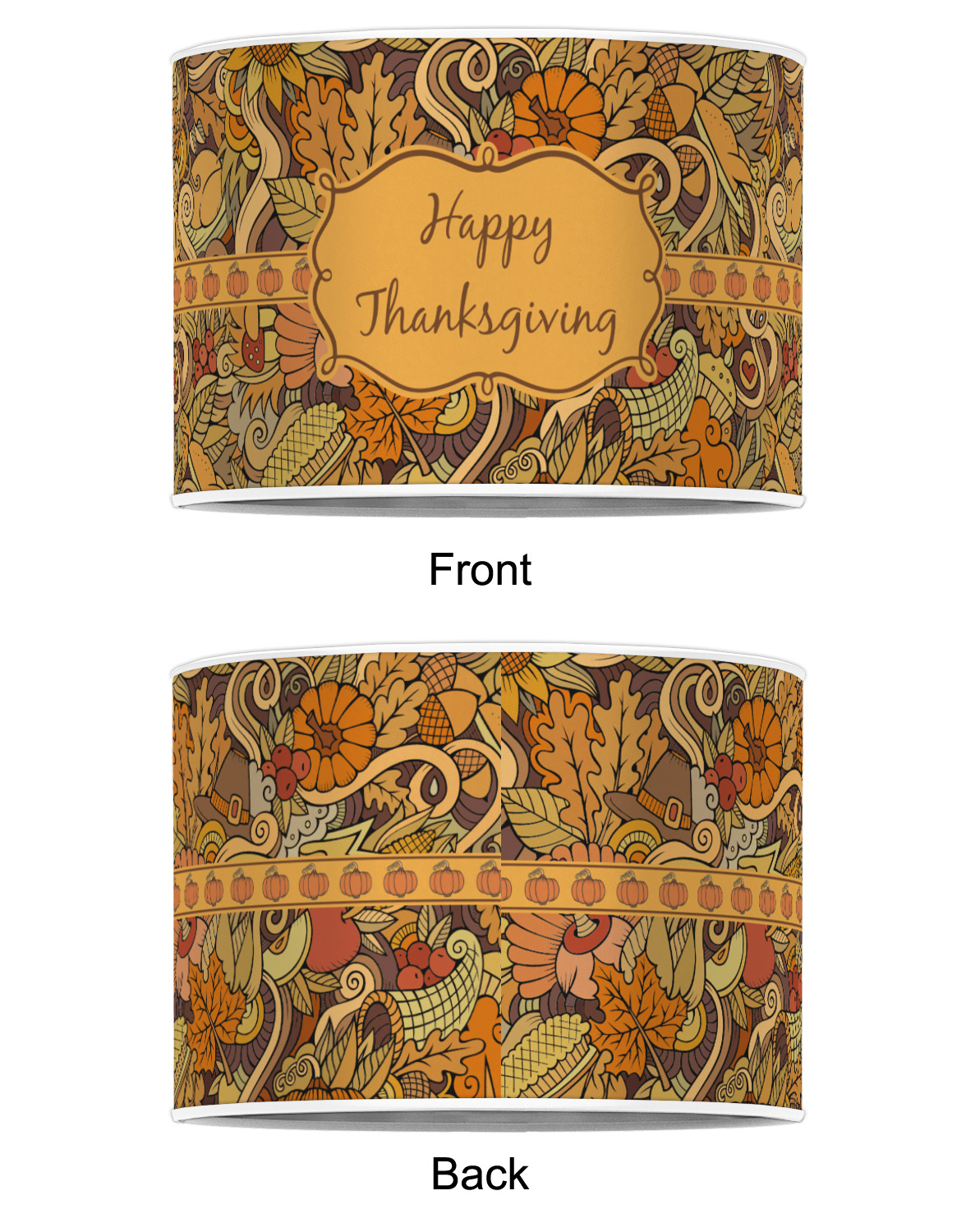This beautiful thanksgiving design is hand drawn and includes many thanksgiving as well as fall traditions. The design colors represent all the beautiful fall colors of brown and orange. We have this pattern available to you in two colors - one is in the classic fall colors of browns and oranges, while the other background is brighter and also includes more reds and greens. We have chosen to use the more classic colors - however, it is super easy to make the change in our customization system.
