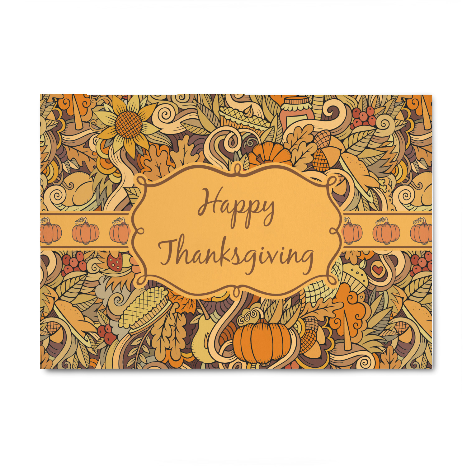 This beautiful thanksgiving design is hand drawn and includes many thanksgiving as well as fall traditions. The design colors represent all the beautiful fall colors of brown and orange. We have this pattern available to you in two colors - one is in the classic fall colors of browns and oranges, while the other background is brighter and also includes more reds and greens. We have chosen to use the more classic colors - however, it is super easy to make the change in our customization system.