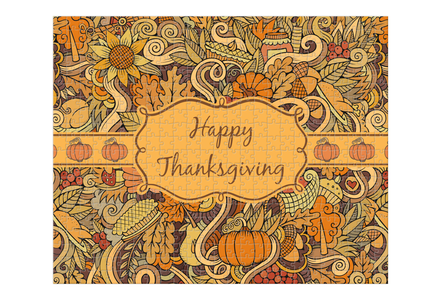This beautiful thanksgiving design is hand drawn and includes many thanksgiving as well as fall traditions. The design colors represent all the beautiful fall colors of brown and orange. We have this pattern available to you in two colors - one is in the classic fall colors of browns and oranges, while the other background is brighter and also includes more reds and greens. We have chosen to use the more classic colors - however, it is super easy to make the change in our customization system.