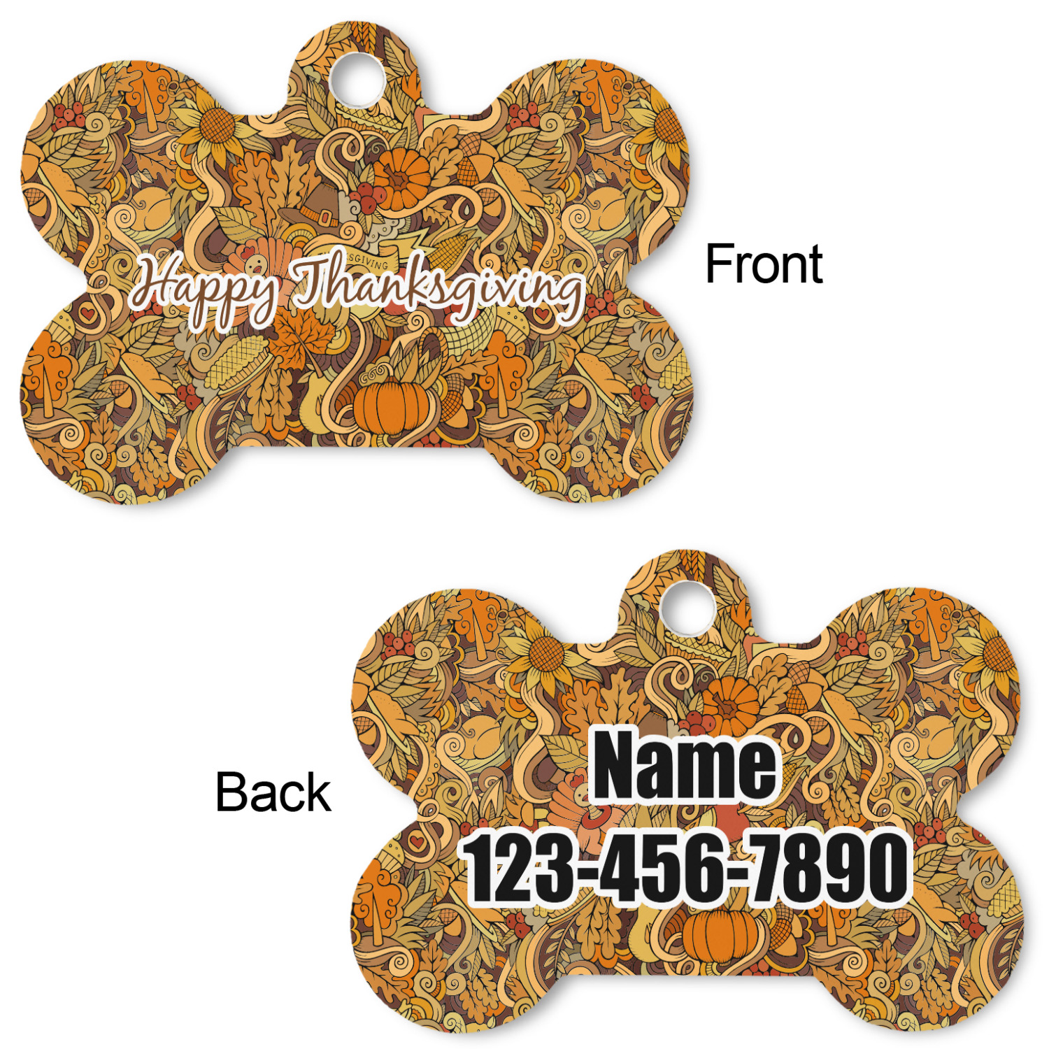 Our default design templates print your dog's personalization on the front and your contact information on the back; however everything is customizable, so you customize the patterns, the colors, the personalization, the contact information etc.