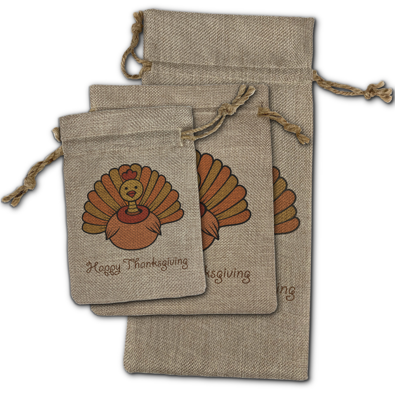 We sell our Burlap Gift Bags in 3 variant sized bags. Made with burlap polyester, each personalized bag can be secured with a twine drawstring pull. Your custom design is available to print on one side or both sides - completely up to you! The sizes of the bags measure approximately 4.5" x 6.5" for the smallest size, 6.5" x 8.0" for the medium size, and 6.5" x 13.5" for the large-sized bag.
