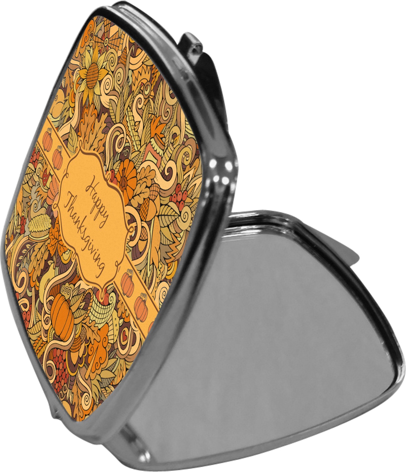 Our compact mirrors are customized with your design on one side. The other side is patterned silver tone metal. Inside, there are two mirrors.