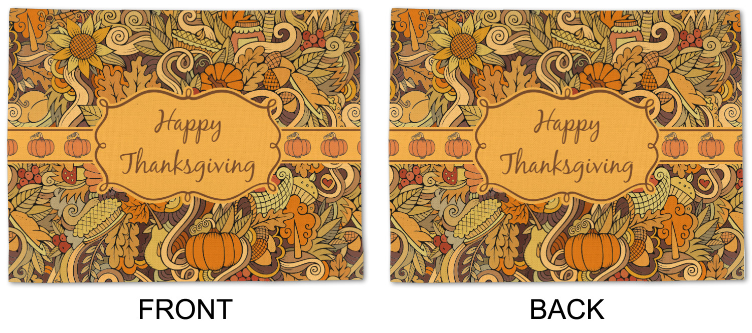 This beautiful thanksgiving design is hand drawn and includes many thanksgiving as well as fall traditions. The design colors represent all the beautiful fall colors of brown and orange. We have this pattern available to you in two colors - one is in the classic fall colors of browns and oranges, while the other background is brighter and also includes more reds and greens. We have chosen to use the more classic colors - however, it is super easy to make the change in our customization system.