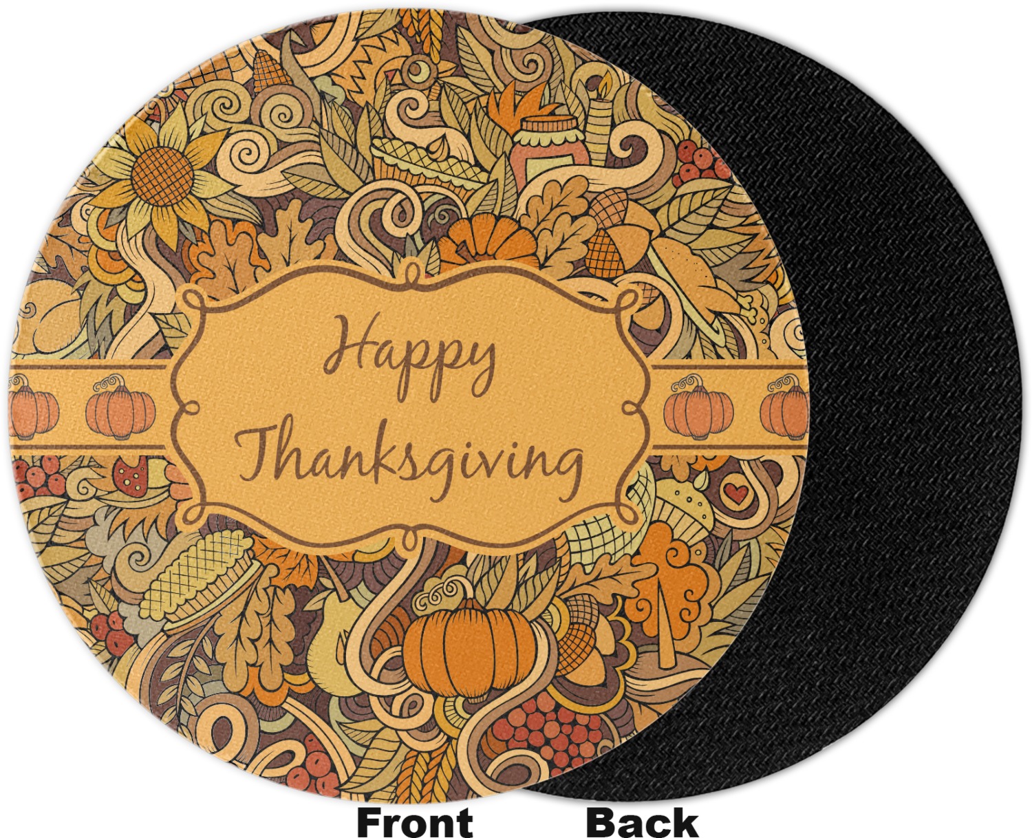 This beautiful thanksgiving design is hand drawn and includes many thanksgiving as well as fall traditions. The design colors represent all the beautiful fall colors of brown and orange. We have this pattern available to you in two colors - one is in the classic fall colors of browns and oranges, while the other background is brighter and also includes more reds and greens. We have chosen to use the more classic colors - however, it is super easy to make the change in our customization system.