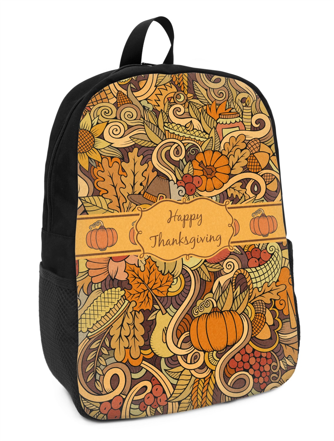 This beautiful thanksgiving design is hand drawn and includes many thanksgiving as well as fall traditions. The design colors represent all the beautiful fall colors of brown and orange. We have this pattern available to you in two colors - one is in the classic fall colors of browns and oranges, while the other background is brighter and also includes more reds and greens. We have chosen to use the more classic colors - however, it is super easy to make the change in our customization system.