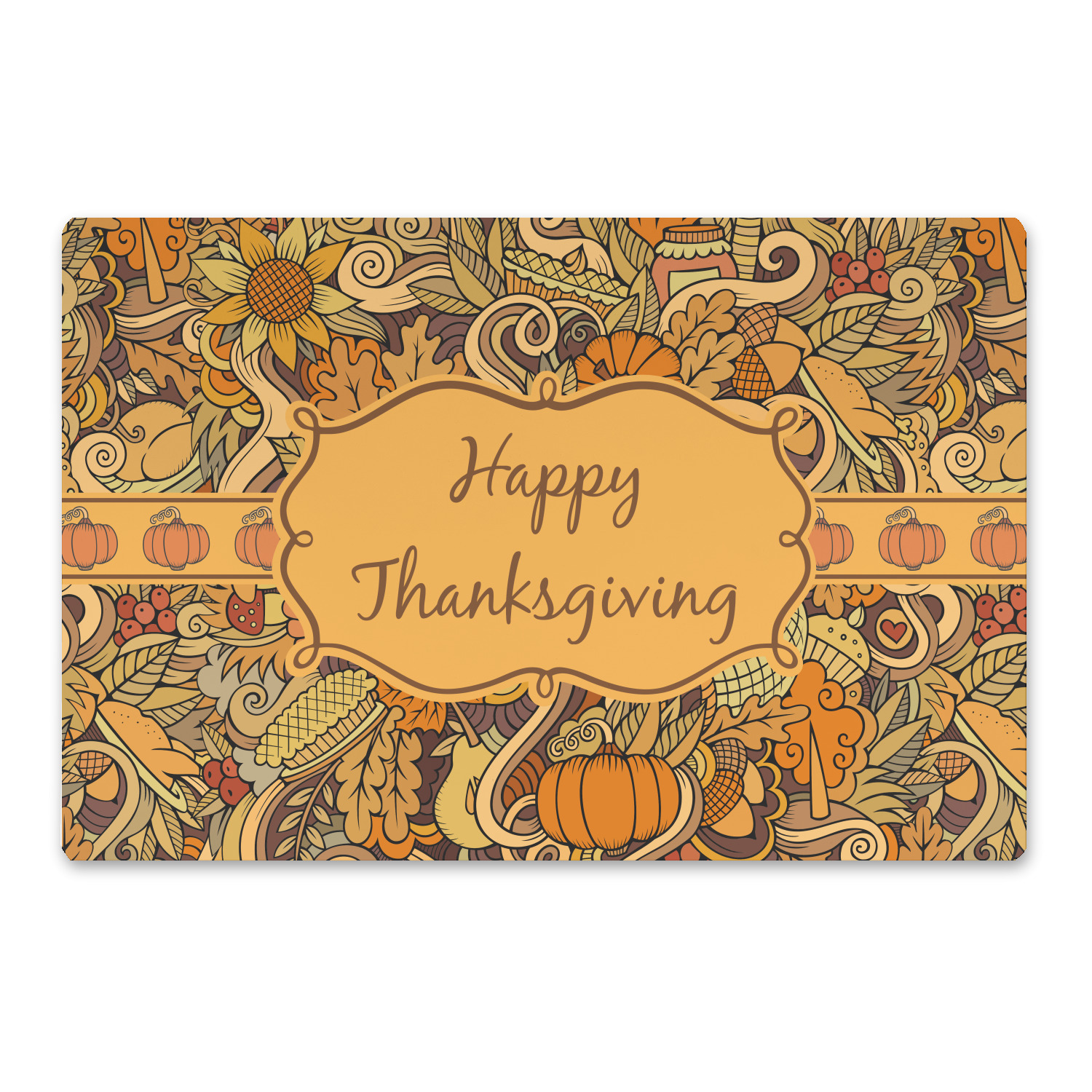 This beautiful thanksgiving design is hand drawn and includes many thanksgiving as well as fall traditions. The design colors represent all the beautiful fall colors of brown and orange. We have this pattern available to you in two colors - one is in the classic fall colors of browns and oranges, while the other background is brighter and also includes more reds and greens. We have chosen to use the more classic colors - however, it is super easy to make the change in our customization system.
