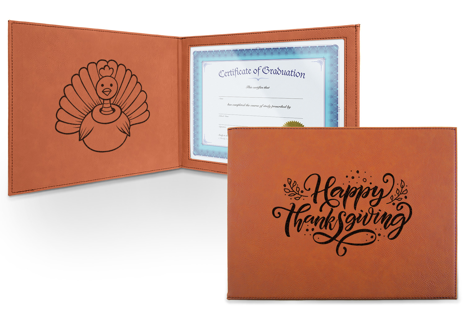This cognac-colored, leatherette certificate jacket is the ideal way to display or store your hard-earned certificate. When closed, the custom certificate holder measures at 12 by 9 inches. The interior of the certificate cover includes a clear, vinyl window to encase your diploma. The window measures at around 10.5 by 7.5 inches and can accommodate a diploma that measures at up to 8.5 by 11 inches. You can either choose to have your customization laser engraved on the front and interior, or solely the front.