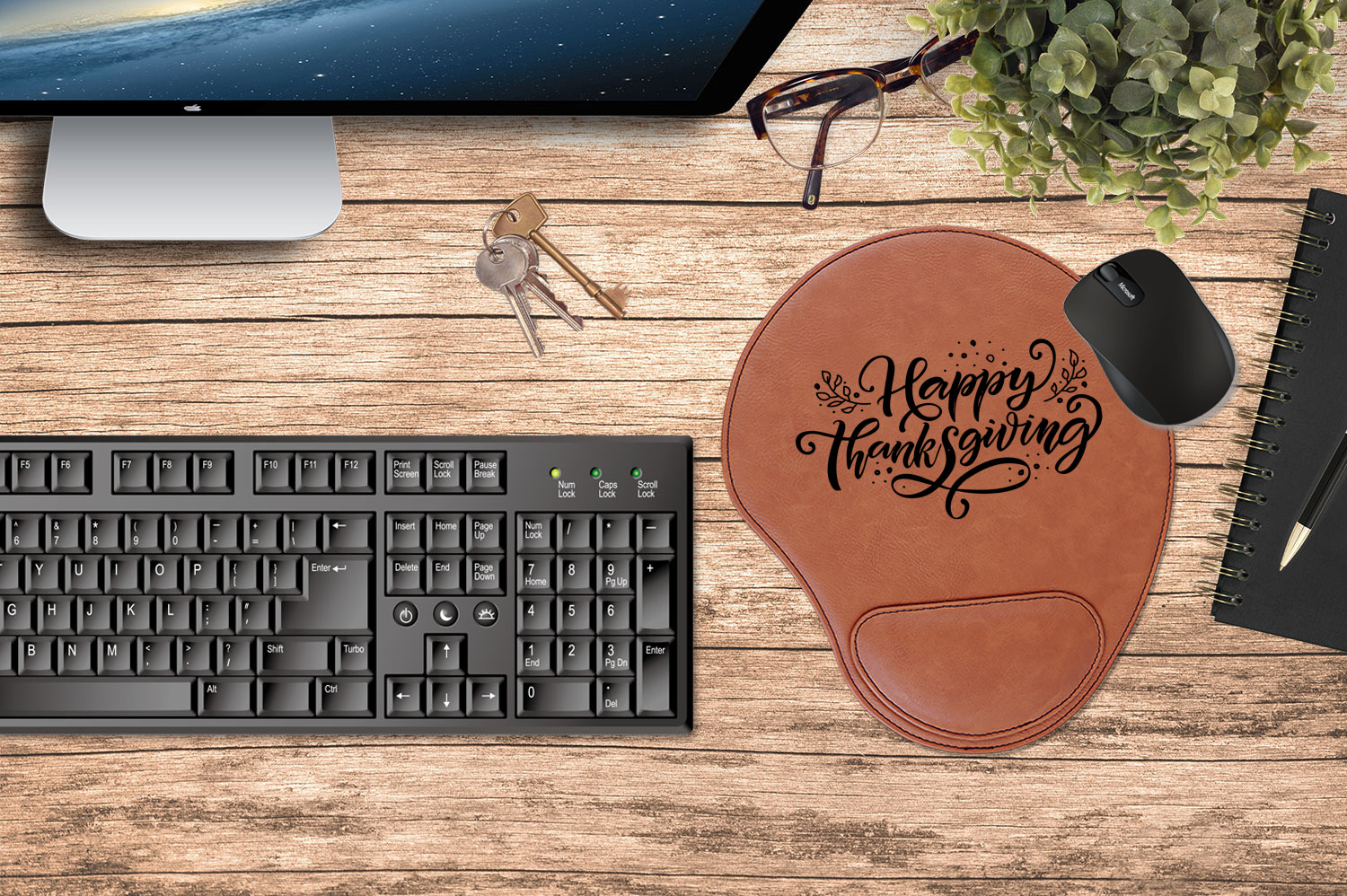 In a rounded shape, this mouse pad is made of a luxurious, cognac-colored leatherette. The nature of this material allows your mouse to glide smoothly across its surface. Strong stitching lines the edges to guarantee stability and strength. As added support for tired wrists, your personalized mouse pad features a supportive wrist rest at its bottom. This model measures at 10.25" x 9", while its wrist pad is approximately 5" x 2.75", with a thickness of 0.75". Your personalized design is laser engraved into the front face of this mouse pad.
