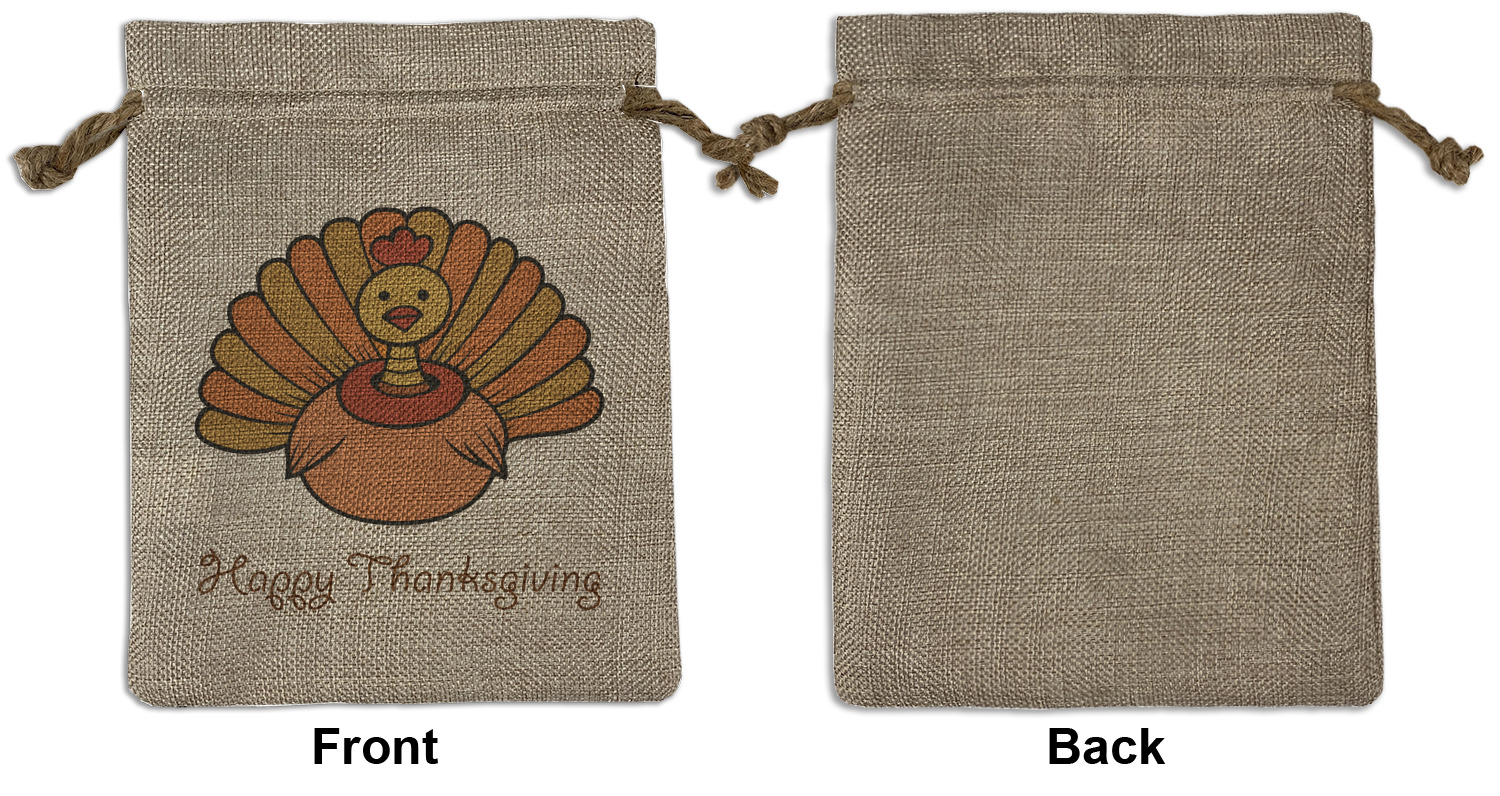 We sell our Burlap Gift Bags in 3 variant sized bags. Made with burlap polyester, each personalized bag can be secured with a twine drawstring pull. Your custom design is available to print on one side or both sides - completely up to you! The sizes of the bags measure approximately 4.5" x 6.5" for the smallest size, 6.5" x 8.0" for the medium size, and 6.5" x 13.5" for the large-sized bag.