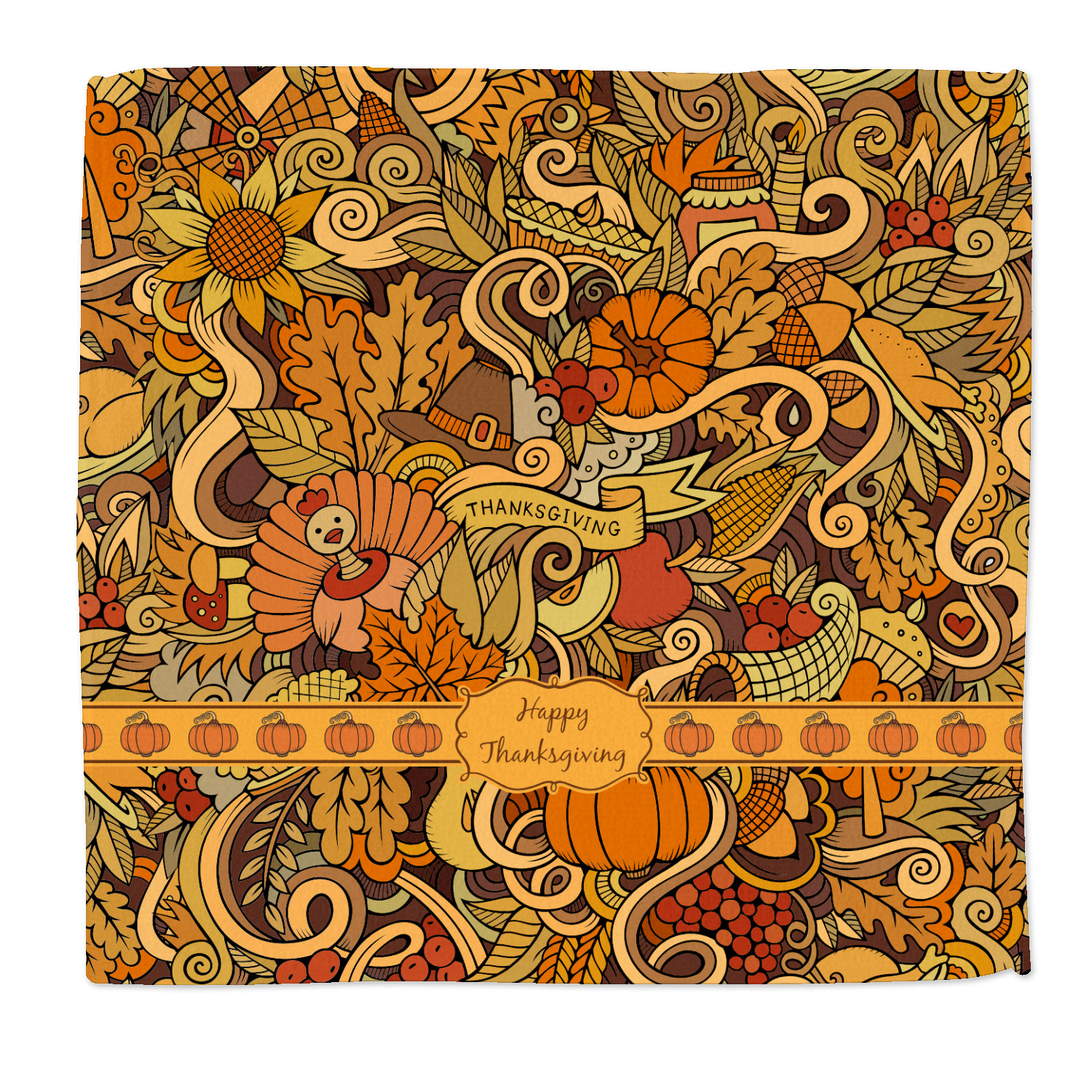 This beautiful thanksgiving design is hand drawn and includes many thanksgiving as well as fall traditions. The design colors represent all the beautiful fall colors of brown and orange. We have this pattern available to you in two colors - one is in the classic fall colors of browns and oranges, while the other background is brighter and also includes more reds and greens. We have chosen to use the more classic colors - however, it is super easy to make the change in our customization system.