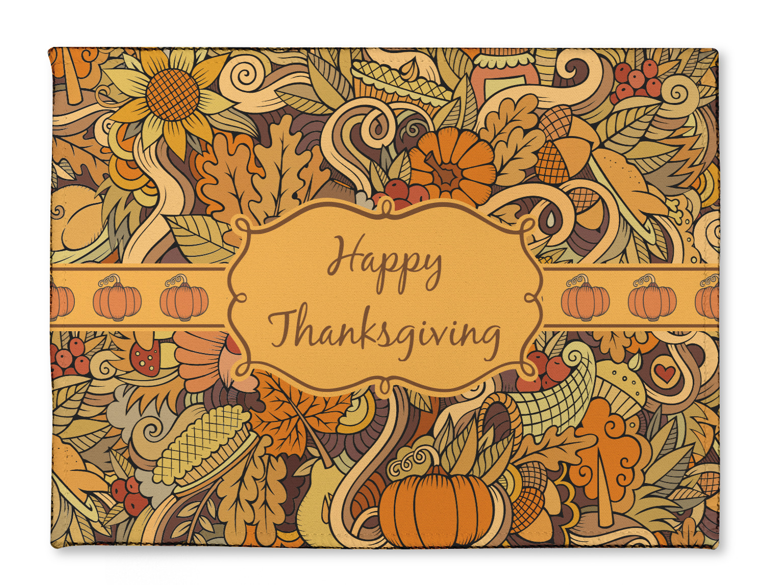 This beautiful thanksgiving design is hand drawn and includes many thanksgiving as well as fall traditions. The design colors represent all the beautiful fall colors of brown and orange. We have this pattern available to you in two colors - one is in the classic fall colors of browns and oranges, while the other background is brighter and also includes more reds and greens. We have chosen to use the more classic colors - however, it is super easy to make the change in our customization system.