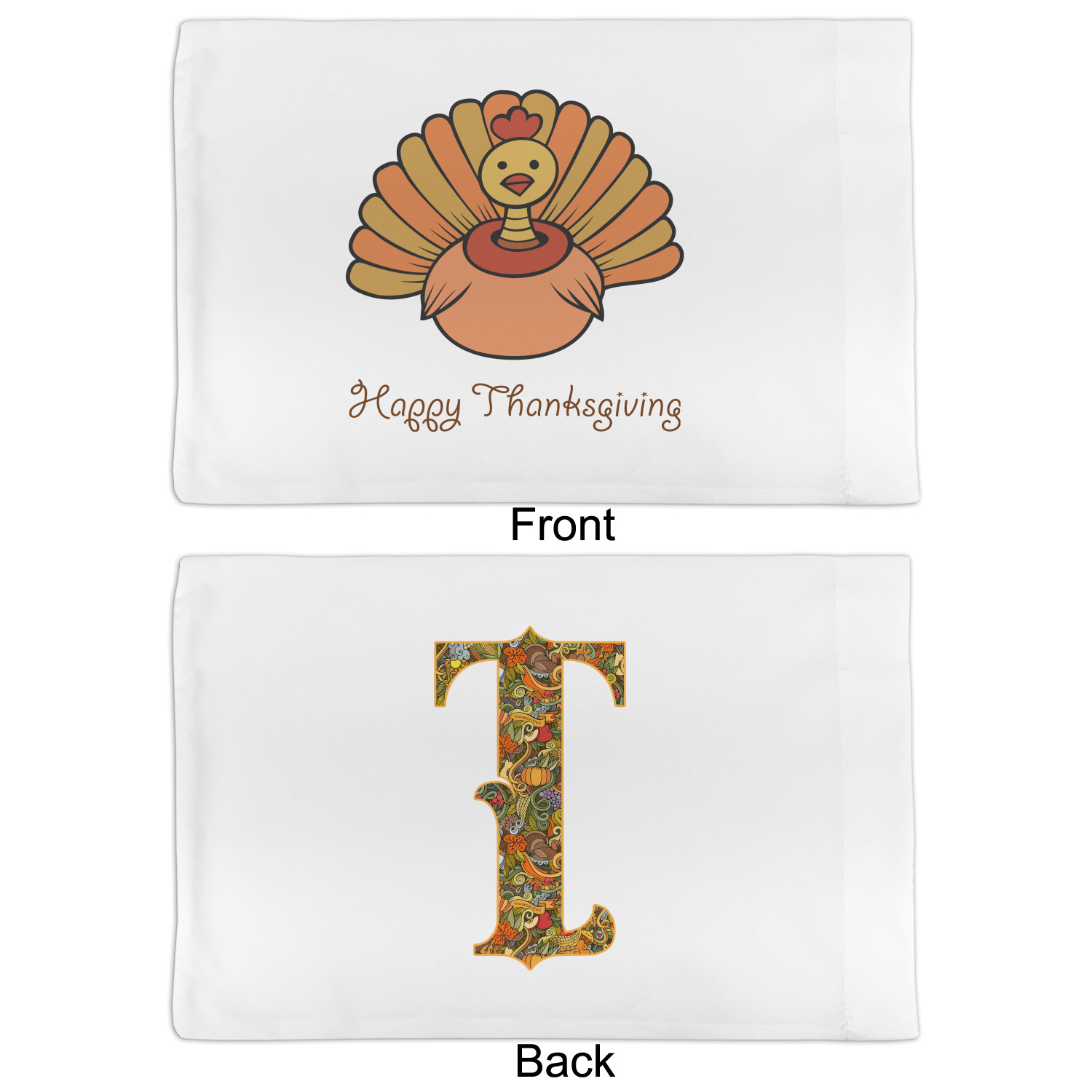This beautiful thanksgiving design is hand drawn and includes many thanksgiving as well as fall traditions. The design colors represent all the beautiful fall colors of brown and orange. We have this pattern available to you in two colors - one is in the classic fall colors of browns and oranges, while the other background is brighter and also includes more reds and greens. We have chosen to use the more classic colors - however, it is super easy to make the change in our customization system.