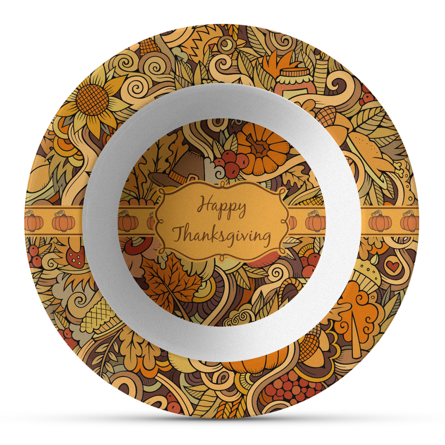 This beautiful thanksgiving design is hand drawn and includes many thanksgiving as well as fall traditions. The design colors represent all the beautiful fall colors of brown and orange. We have this pattern available to you in two colors - one is in the classic fall colors of browns and oranges, while the other background is brighter and also includes more reds and greens. We have chosen to use the more classic colors - however, it is super easy to make the change in our customization system.