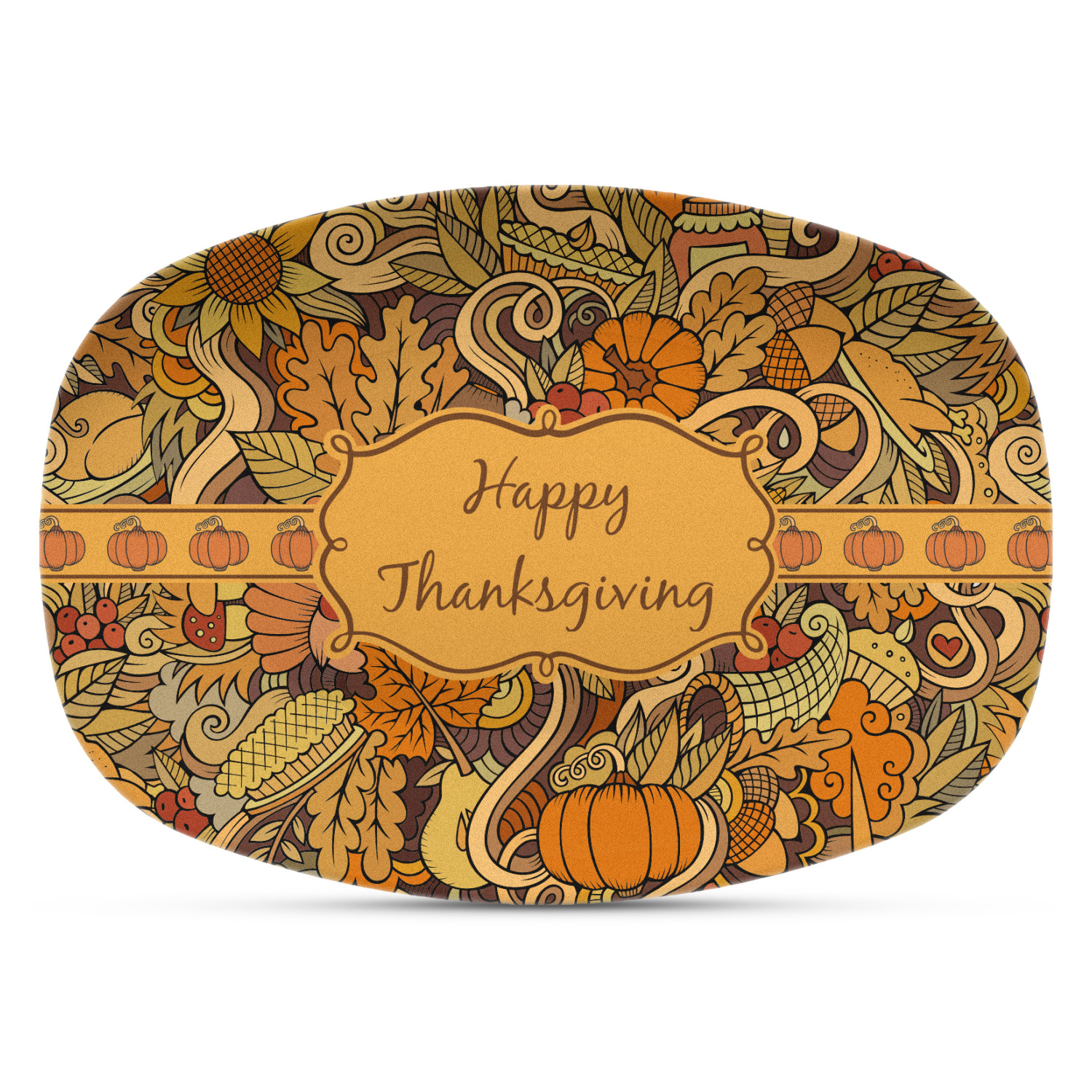This beautiful thanksgiving design is hand drawn and includes many thanksgiving as well as fall traditions. The design colors represent all the beautiful fall colors of brown and orange. We have this pattern available to you in two colors - one is in the classic fall colors of browns and oranges, while the other background is brighter and also includes more reds and greens. We have chosen to use the more classic colors - however, it is super easy to make the change in our customization system.