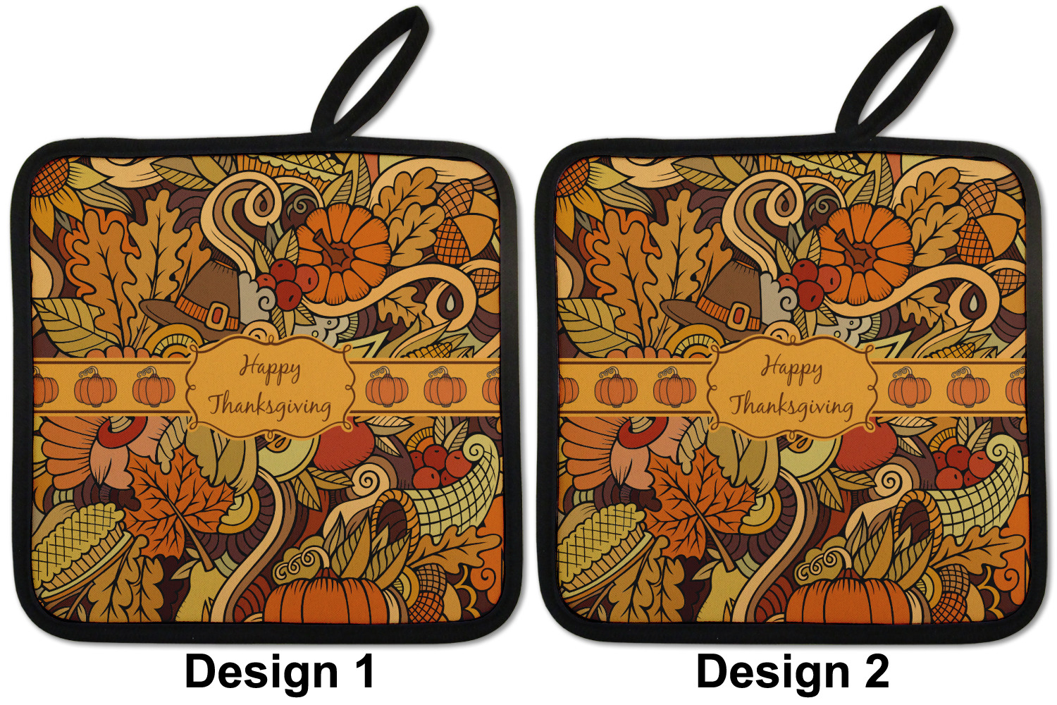 This beautiful thanksgiving design is hand drawn and includes many thanksgiving as well as fall traditions. The design colors represent all the beautiful fall colors of brown and orange. We have this pattern available to you in two colors - one is in the classic fall colors of browns and oranges, while the other background is brighter and also includes more reds and greens. We have chosen to use the more classic colors - however, it is super easy to make the change in our customization system.