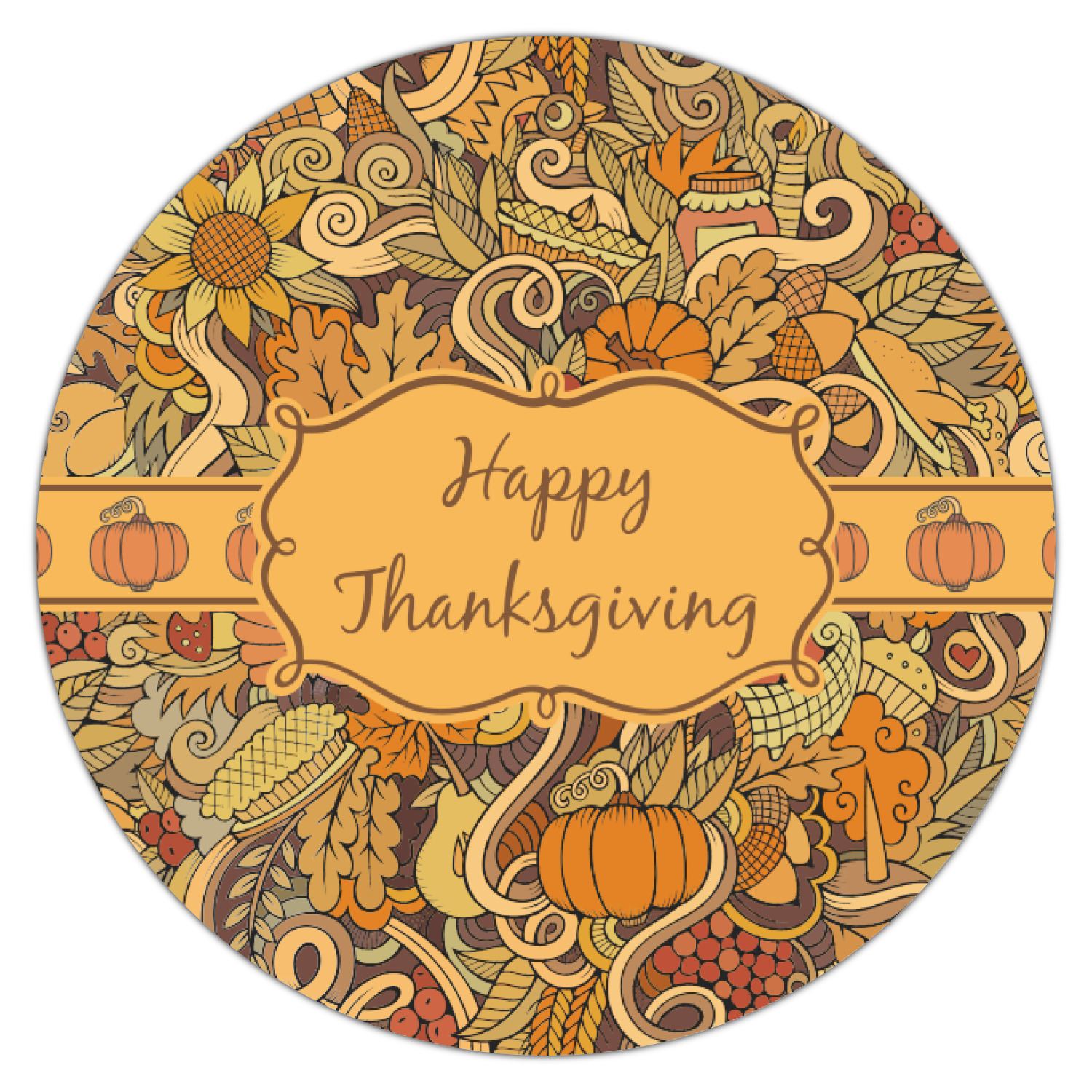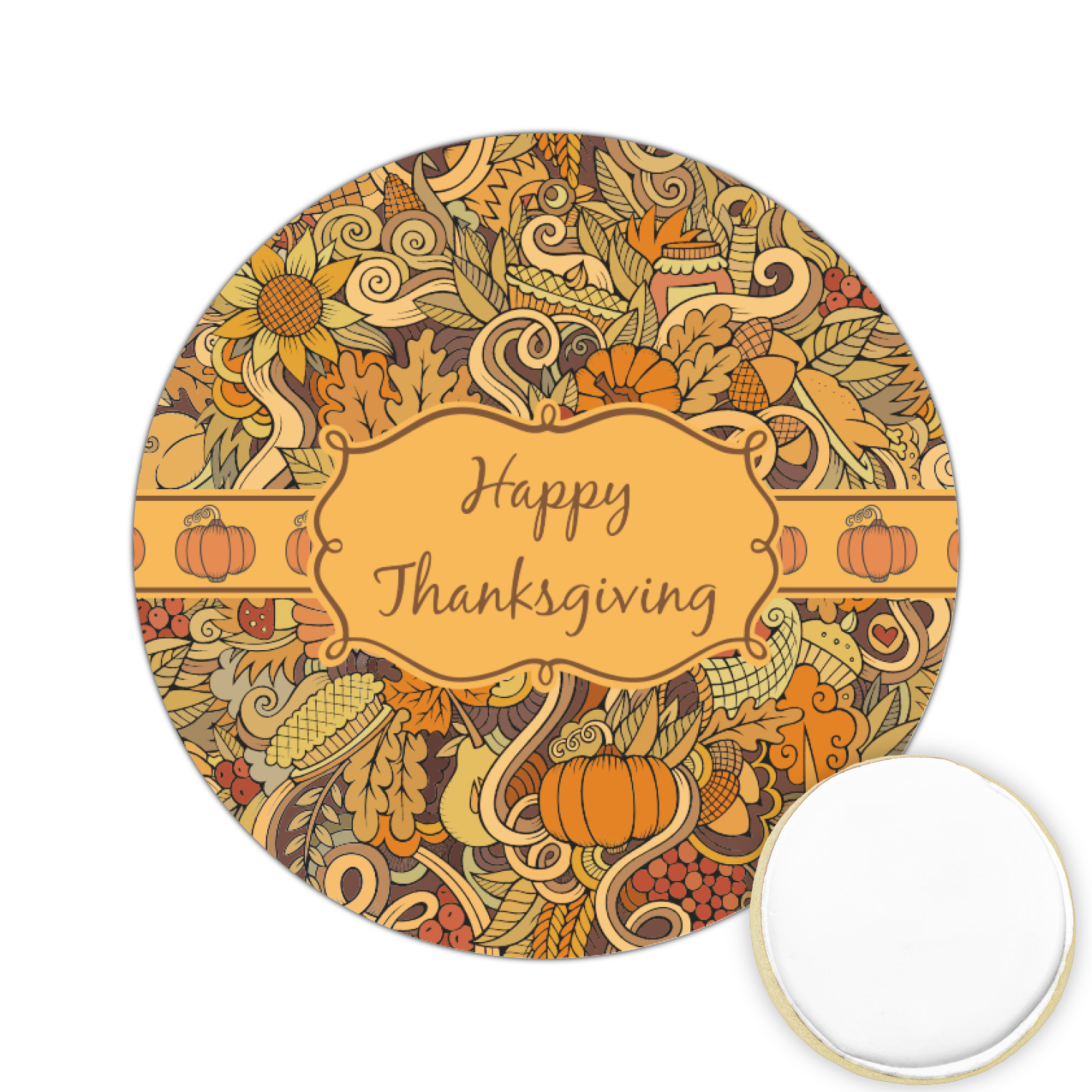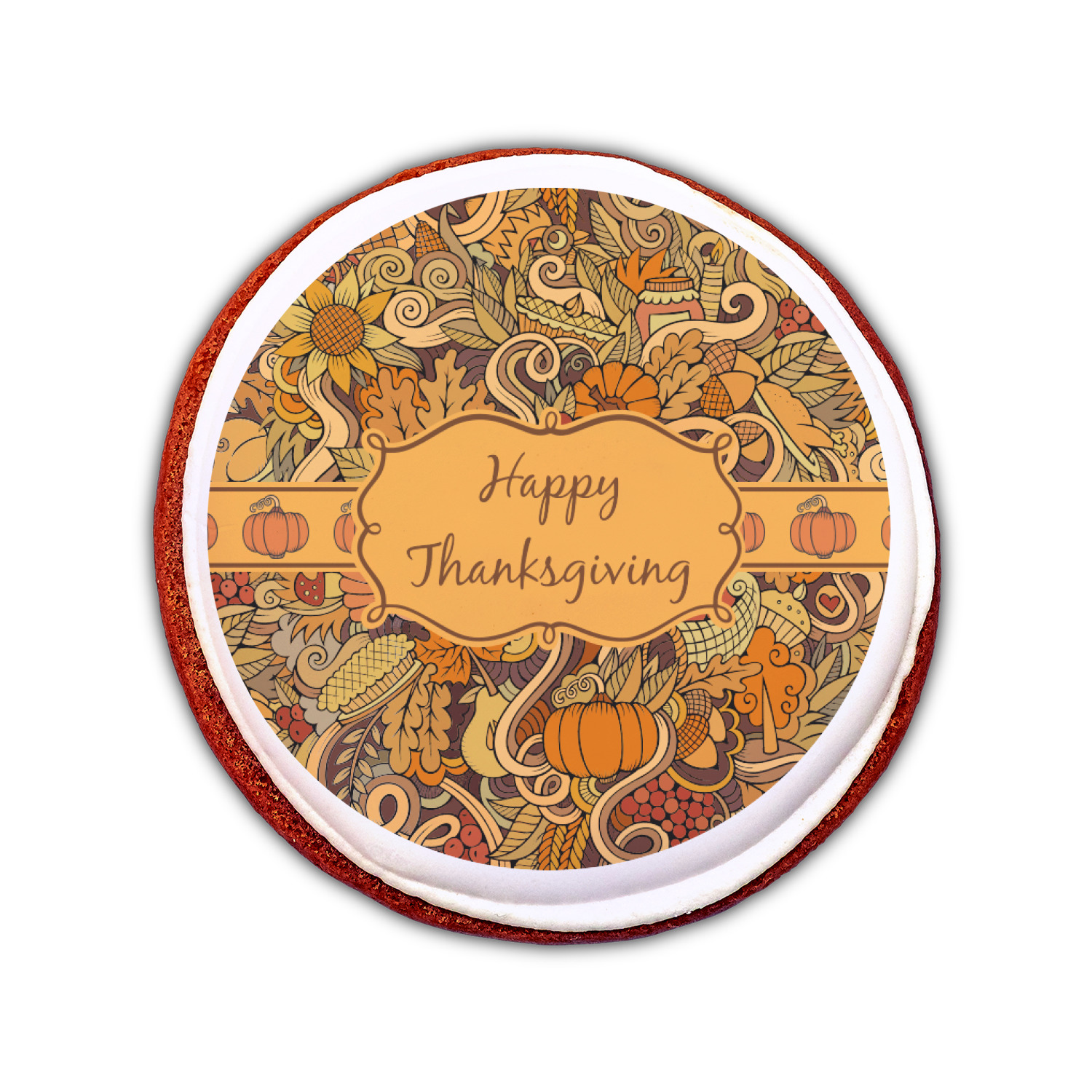 This beautiful thanksgiving design is hand drawn and includes many thanksgiving as well as fall traditions. The design colors represent all the beautiful fall colors of brown and orange. We have this pattern available to you in two colors - one is in the classic fall colors of browns and oranges, while the other background is brighter and also includes more reds and greens. We have chosen to use the more classic colors - however, it is super easy to make the change in our customization system.