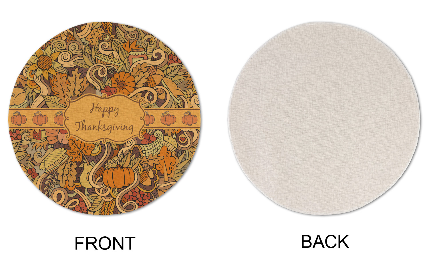 This beautiful thanksgiving design is hand drawn and includes many thanksgiving as well as fall traditions. The design colors represent all the beautiful fall colors of brown and orange. We have this pattern available to you in two colors - one is in the classic fall colors of browns and oranges, while the other background is brighter and also includes more reds and greens. We have chosen to use the more classic colors - however, it is super easy to make the change in our customization system.
