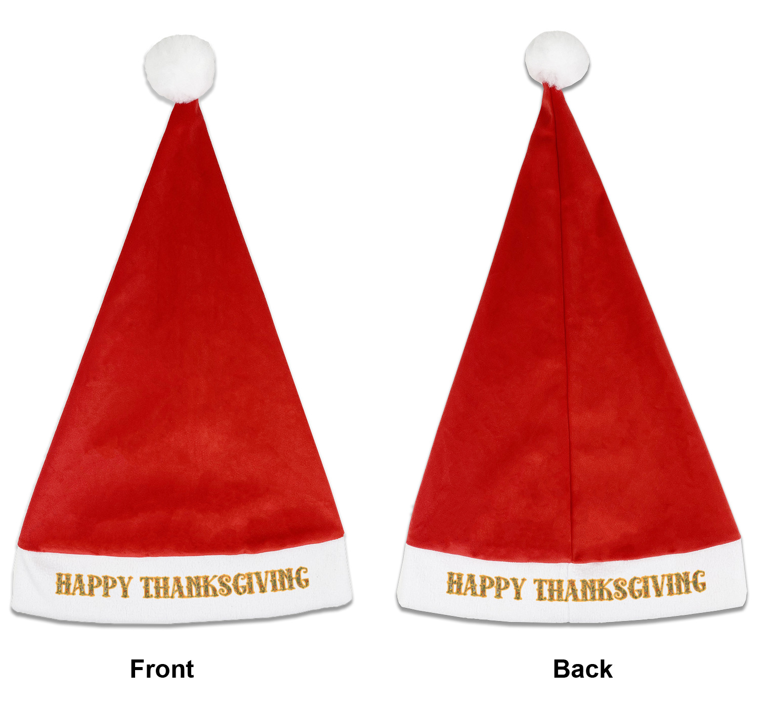 Our Santa hats are a soft, velvety polyester material. These customizable Santa hats are a classic red with white brimming and pom pom ball hanging off the hat tail just like Santa Claus! Each personalized Santa hat is approximately 17.5 L x 11.8 W. We offer two different styles to print your designs on the white brim - front or front & back.
