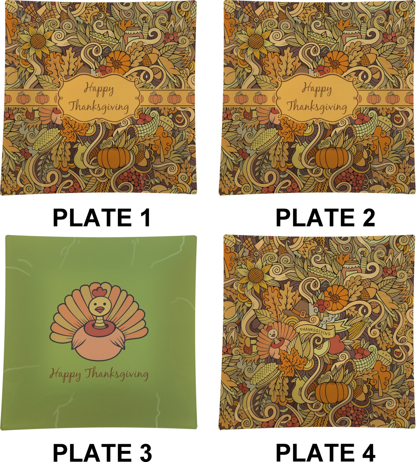 This beautiful thanksgiving design is hand drawn and includes many thanksgiving as well as fall traditions. The design colors represent all the beautiful fall colors of brown and orange. We have this pattern available to you in two colors - one is in the classic fall colors of browns and oranges, while the other background is brighter and also includes more reds and greens. We have chosen to use the more classic colors - however, it is super easy to make the change in our customization system.