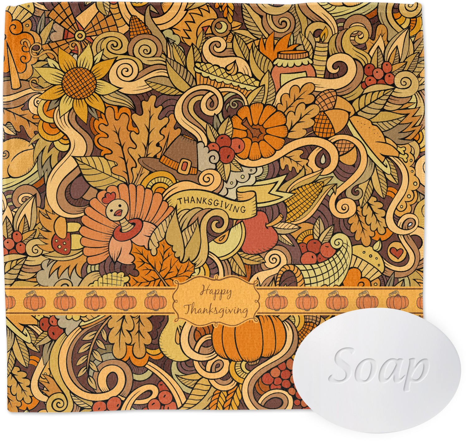 This beautiful thanksgiving design is hand drawn and includes many thanksgiving as well as fall traditions. The design colors represent all the beautiful fall colors of brown and orange. We have this pattern available to you in two colors - one is in the classic fall colors of browns and oranges, while the other background is brighter and also includes more reds and greens. We have chosen to use the more classic colors - however, it is super easy to make the change in our customization system.