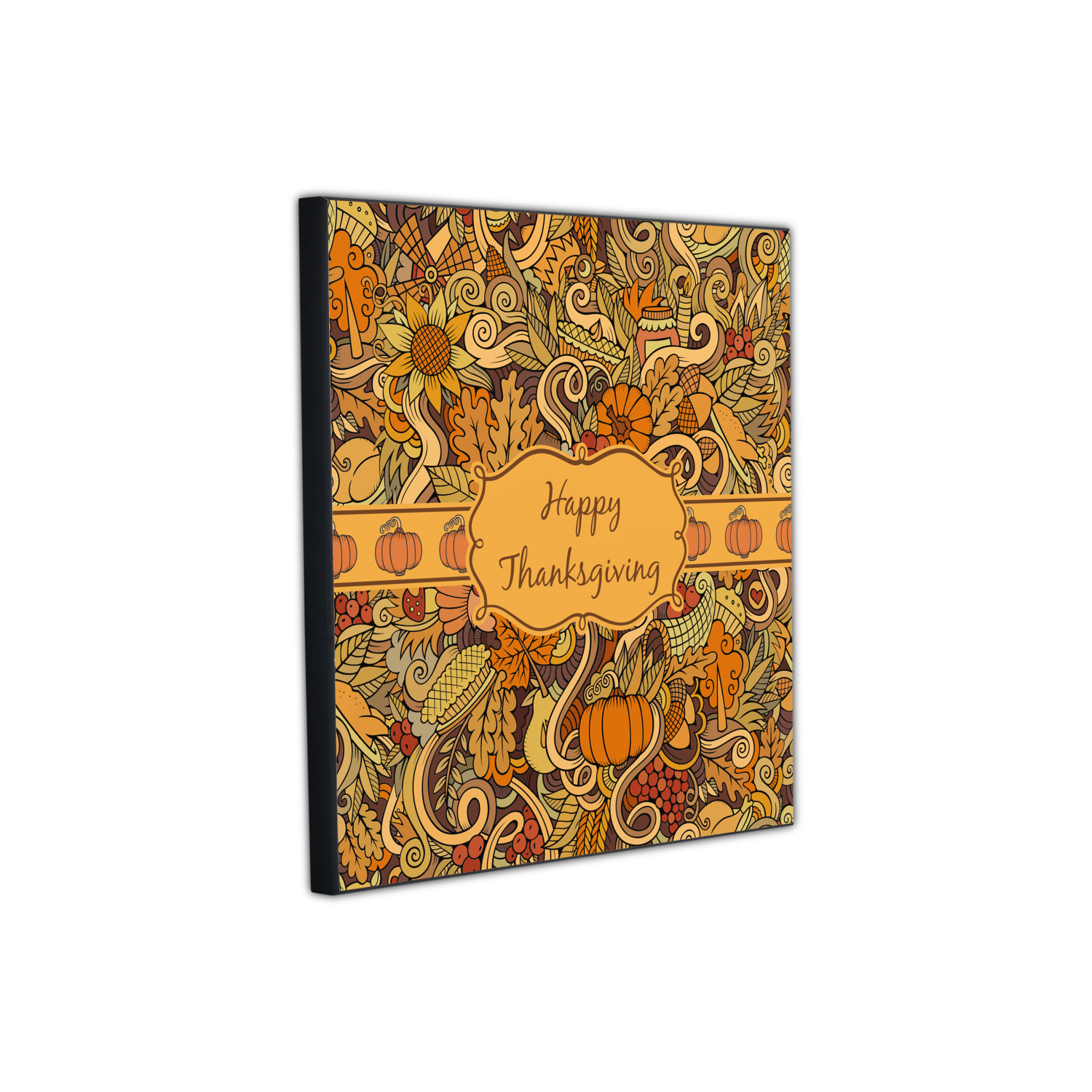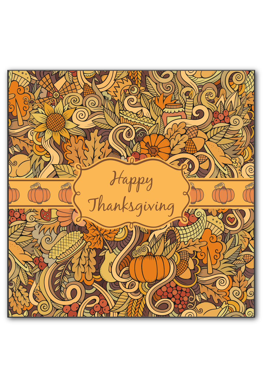 This beautiful thanksgiving design is hand drawn and includes many thanksgiving as well as fall traditions. The design colors represent all the beautiful fall colors of brown and orange. We have this pattern available to you in two colors - one is in the classic fall colors of browns and oranges, while the other background is brighter and also includes more reds and greens. We have chosen to use the more classic colors - however, it is super easy to make the change in our customization system.