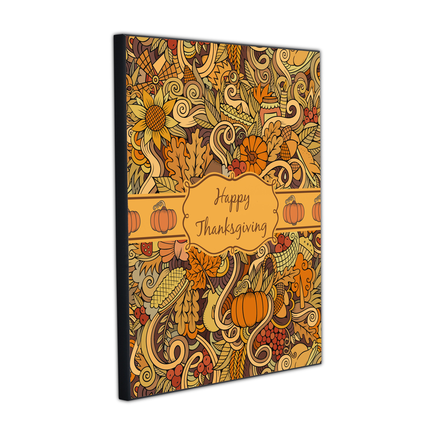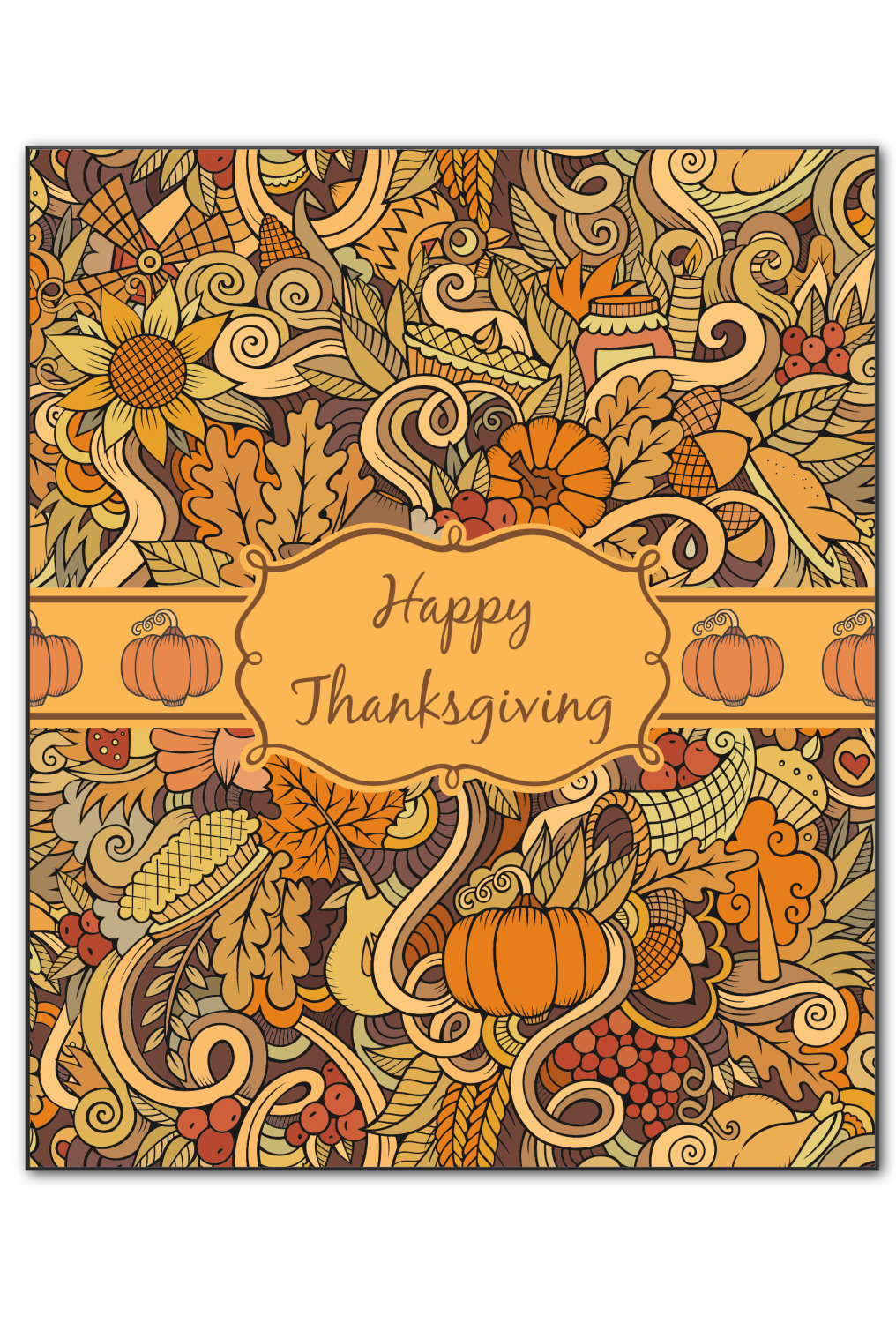 This beautiful thanksgiving design is hand drawn and includes many thanksgiving as well as fall traditions. The design colors represent all the beautiful fall colors of brown and orange. We have this pattern available to you in two colors - one is in the classic fall colors of browns and oranges, while the other background is brighter and also includes more reds and greens. We have chosen to use the more classic colors - however, it is super easy to make the change in our customization system.