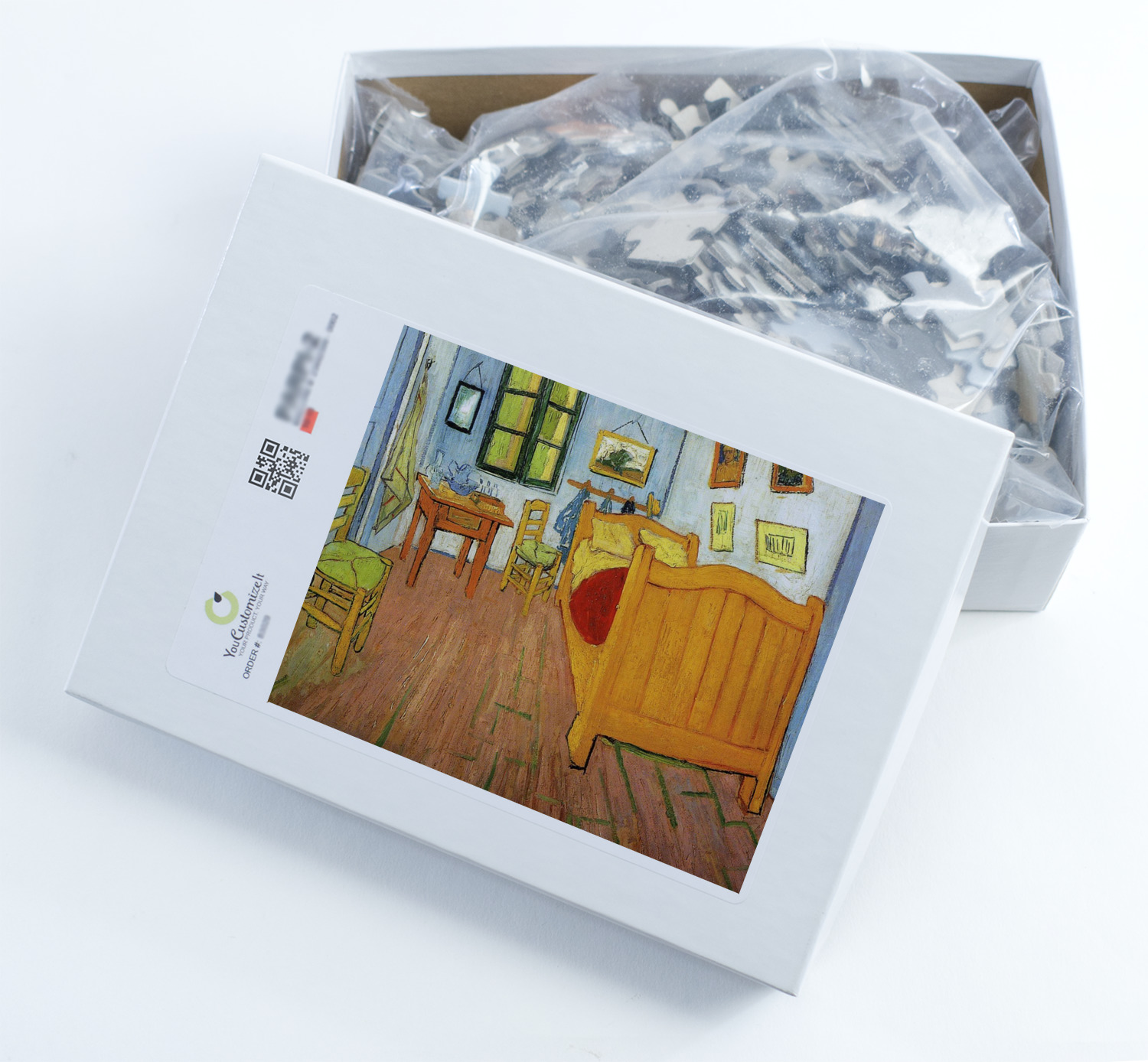 We print our puzzles on thick white chipboard in vibrant colors, then laminate the chipboard and die cut your puzzle. Your jigsaw puzzle is shipped to you in a box with the image of the puzzle on the box.